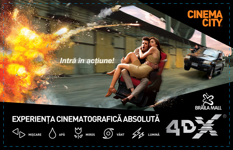Brăilenii amatori de filme văzute la cinematograf au, începând vineri, 4 august, posibilitatea de a viziona pelicule în format 4DX, într-o sală dotată cu scaune speciale care se mişcă în ritmul acţiunii. Totodată, spectatorii sunt împroşcaţi cu mici jeturi de apă, cu curenţi de aer sau cu odorizante ce reproduc mirosurile pe care le-ar exeperimenta dacă s-ar afla în universul cinematografic proiectat pe ecran. Practic, prin combinaţiile de mişcări ale scaunelor 4DX şi prin efectele speciale perfect sincronizate cu anumite scene, sunt stimulate toate cele cinci simţuri, astfel încât spectatorii să aibă senzaţia că sunt protagonişti ai filmului, aflându-se chiar în miezul acţiunii.