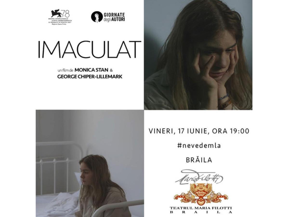 Vineri, 17 iunie, de la ora 19.00, aveți ocazia de a vedea la Teatrul ”Maria Filotti” filmul ”Imaculat”, câștigător anul trecut a trei premii la Festivalul de Film de la Veneția. Pelicula este o dramă psihologică, în care personajul principal ajunge să fie acaparat, subjugat, în vreme ce intervențiile celor care ar fi trebuit să îl apere, ale personalului medical, se întâmplă exclusiv în situații extreme.