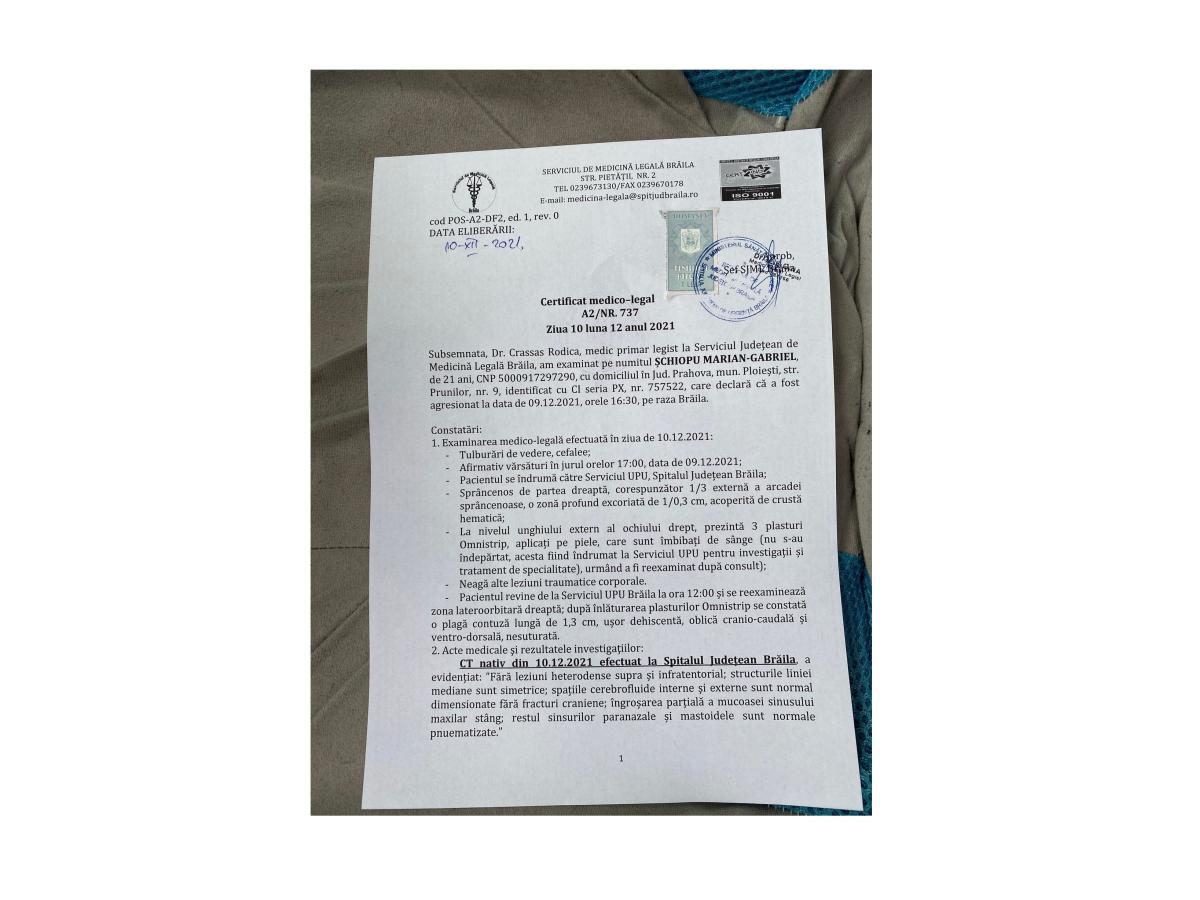 Gabriel Şchiopu a dat joi, după incident, declarații la Poliție, iar vineri a mers la Serviciul Județean de Medicină Legală Brăila. După ce a fost examinat a primit 9 zile de îngrijiri medicale.