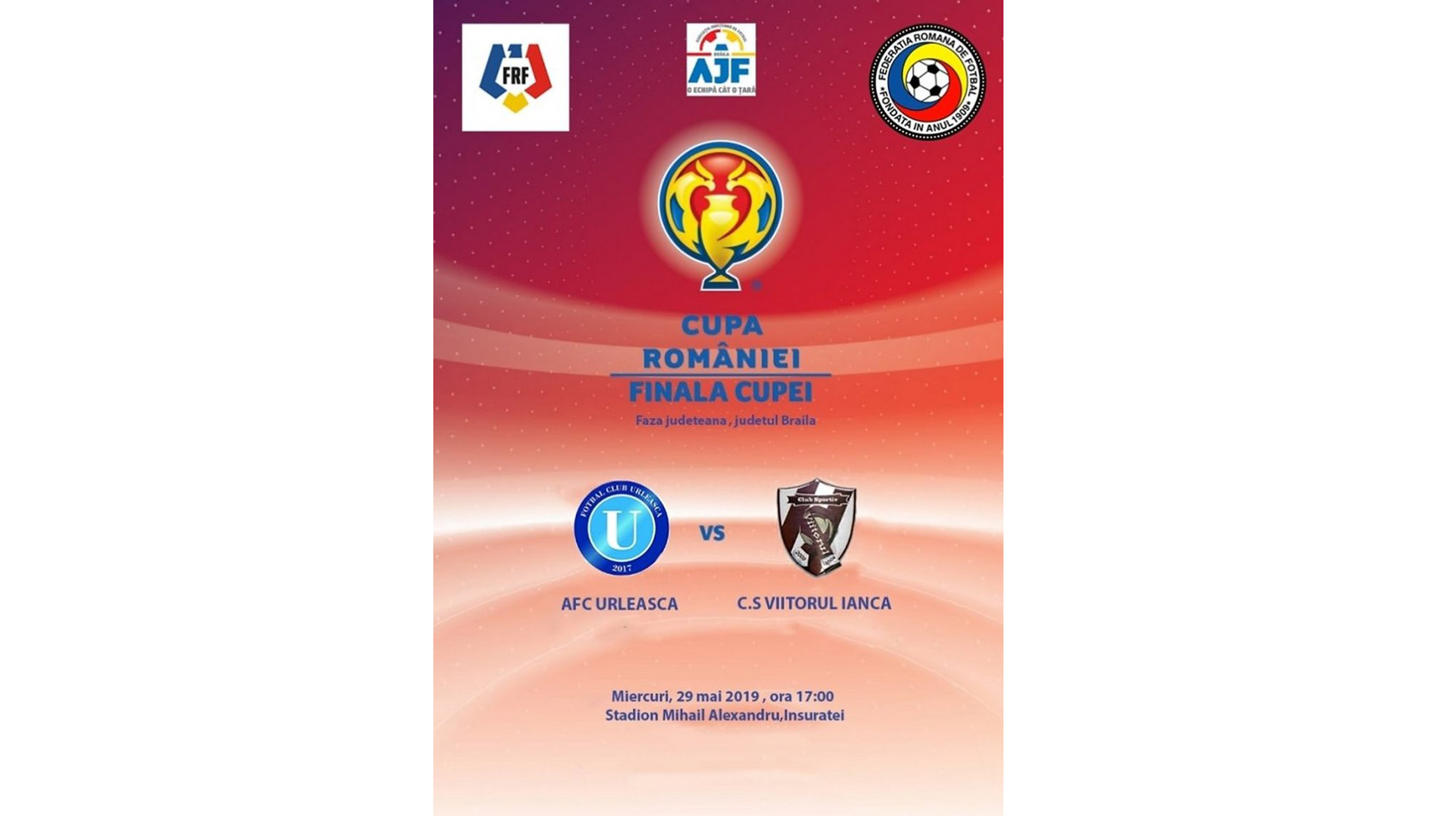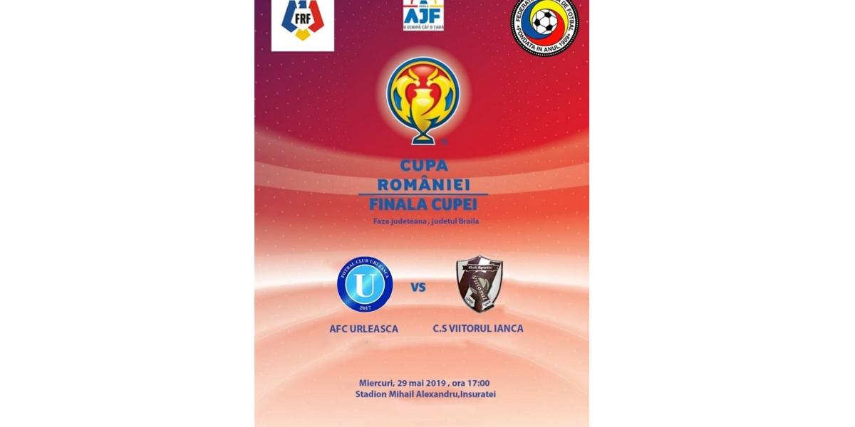 Astăzi, de la ora 17.00, la Însurăţei se dispută finala Cupei României, faza judeţeană, în care adversare sunt Viitorul Ianca, echipă care deja şi-a asigurat participarea la barajul de promovare în Liga a III-a şi revelaţia sezonului competiţional 2018-2019, AFC Urleasca.
