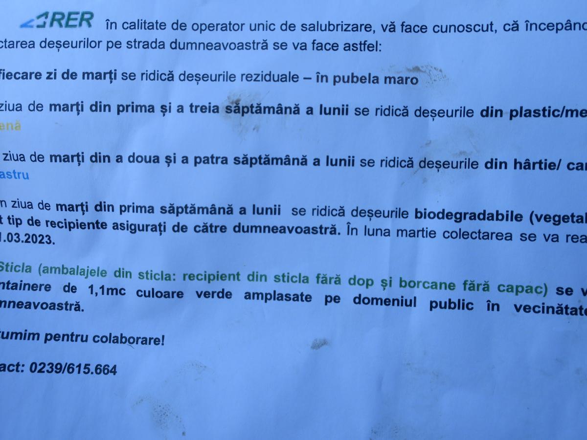 În baza unei sesizări primite la redacție, am solicitat un punct de vedere de la conducerea RER referitor la această situație. Ni s-a spus că, așa cum figurează pe site-ul socetății și așa cum au fost anunțați locatarii în cauză, prin intermediul ”fluturașilor” distribuiți la fiecare adresă în parte, deșeurile vegetale se preiau în ultima zi de marți. Totuși, după ce le-au fost arătate înștiințările primite de cetățeni, pe care scrie, negru pe alb, că vegetalul se ridică în prima zi de marți, reprezentanții RER au admis că este vorba despre o eroare de comunicare ce nu le poate fi imputată locatarilor. În consecință, a fost trimisă pe teren o mașină pentru preluarea sacilor cu deșeuri vegetale care încă se mai aflau în fața porților. Totodată, pe străzile în cauză, au fost distribuite, zilele trecute, alte înștiințări, cu informații corecte referitoare la modul cum se preiau deșeurile vegetale, în ultima zi de marți a fiecărei luni.