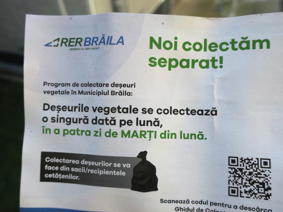 Colectarea selectivă a deșeurilor de către operatorul unic RER Brăila, care se derulează la nivel de municipiu și județ din luna martie a acestui an, a început, în general, bine, însă au apărut și unele probleme cauzate de erori de comunicare, pe care firma în cauză s-a arătat dispusă să le corecteze ”din mers”. O astfel de situație ne-a fost semnalată pe anumite străzi din cartierul Chercea, unde locatarii au fost anunțați eronat, prin înștiințările primite în poștă, la începutul lunii martie, că ridicarea deșeurilor vegetale - frunze, crengi și diverse plante rezultate din curățarea grădinilor și a spațiilor verzi - se va face o singură dată pe lună, în prima zi de marți a fiecărei luni. Ori, programarea pentru acest tip de deșeu era, de fapt, în ultima zi de marți a lunii. Cert este că acei locatari care și-au scos, marți, 2 mai, în fața porții resturile vegetale adunate din curțile și grădinile proprii au avut neplăcuta surpriză să constate că acestea n-au fost ridicate de lucrătorii firmei RER.