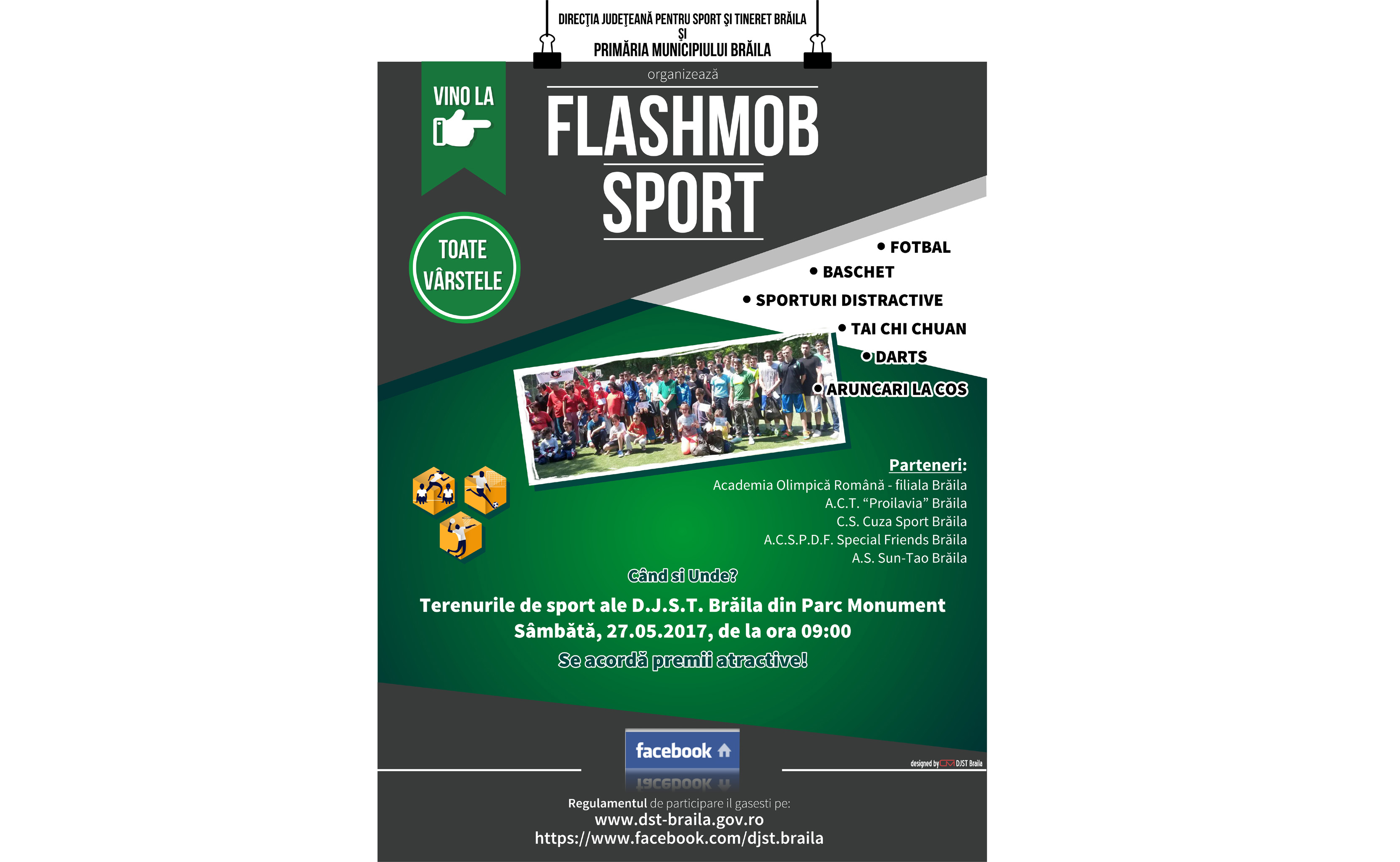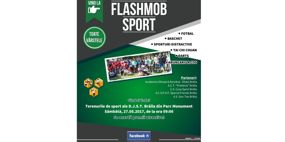 Sâmbătă, 27 mai, la baza sportivă a Direcţiei Judeţene pentru Sport şi Tineret din Parcul Monument are loc ediţia a V-a a FlashMob Sport, eveniment sportiv organizat de DJST şi Primăria Brăila, în colaborare cu Academia Olimpică Română – Filiala Brăila, ACT Proilavia, CS Cuza Sport, ACSPDF Special Friends, AS “Sun-Tao” Brăila. Acţiunea se adresează, ca de obicei, publicului brăilean de toate vârstele, iar disciplinele sportive propuse de organizatori la această ediţie sunt fotbal, baschet, tai chi chuan şi sporturi distractive.