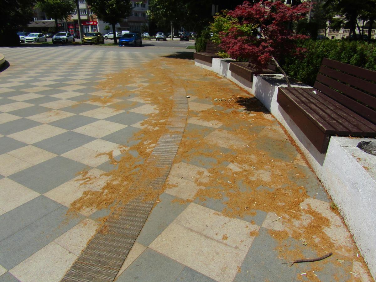 • florile și polenul care s-au scuturat din acești copaci formează pe trotuare o mâzgă aluneacoasă, pe care pietonii pot aluneca oricând • la fel se întâmplă și cu dudele care înegresc trotuarele în mai multe zone din oraș...