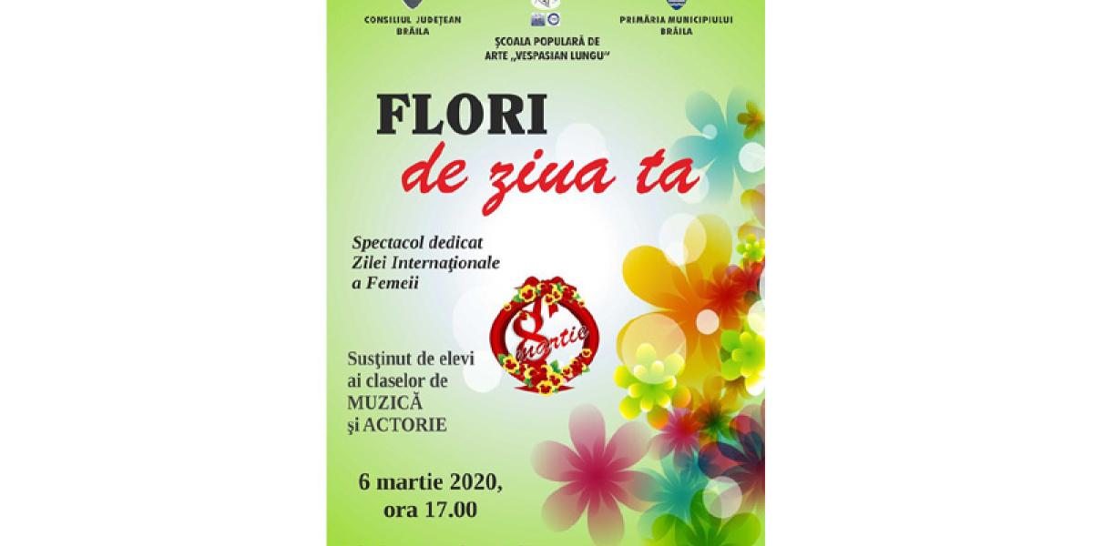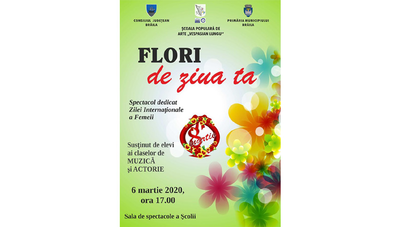 Vineri, 6 martie, începând cu ora 17.00, la Şcoala Populară de Arte “Vespasian Lungu” Brăila va avea loc spectacolul “Flori de ziua ta”, organizat cu prilejul Zilei Internaţionale a Femeii.