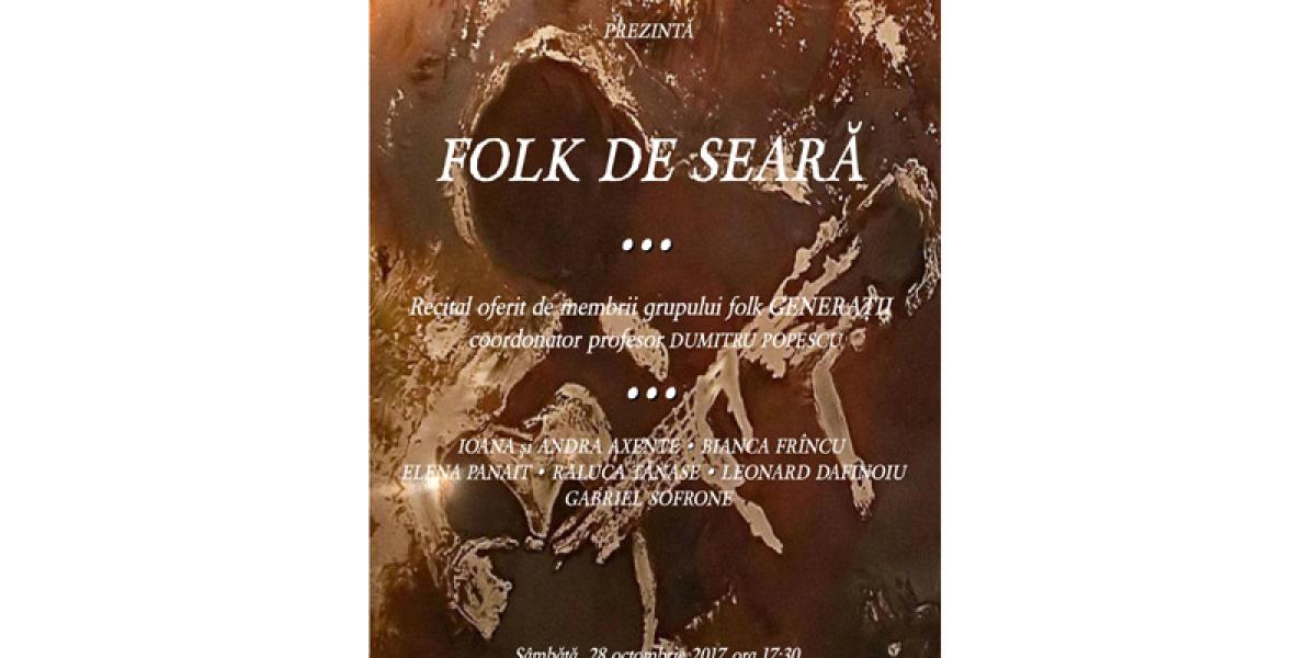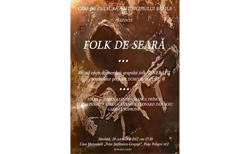 • sâmbătă, 28 octombrie 2017, de la ora 17:30, la Casa Memorială “Petre Ştefănescu-Goangă” va avea loc un recital de muzică folk oferit de membrii grupului “Generaţii”