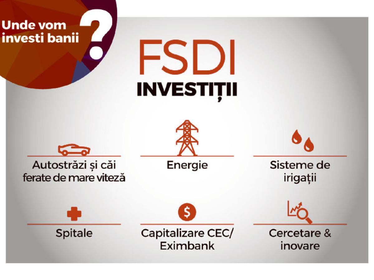 - Autostrăzi, căi ferate rapide şi proiecte energetice (dar care nu sunt prinse pe fonduri europene). „Construcţia de autostrăzi va fi principala zonă de investiţii vizată de FSDI. Având în vedere sursele de venituri arătate mai sus, va fi pentru prima oară când Guvernul va avea un instrument care poate asigura finanţarea certă a autostrăzilor, astfel încât să avem garanţia că un proiect început va putea fi dus la capăt fără riscul blocării sau al unor amânări pe parcurs”, declară fostul ministru al Economiei.