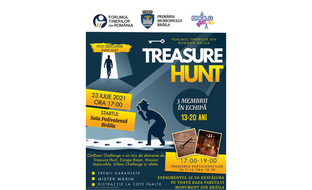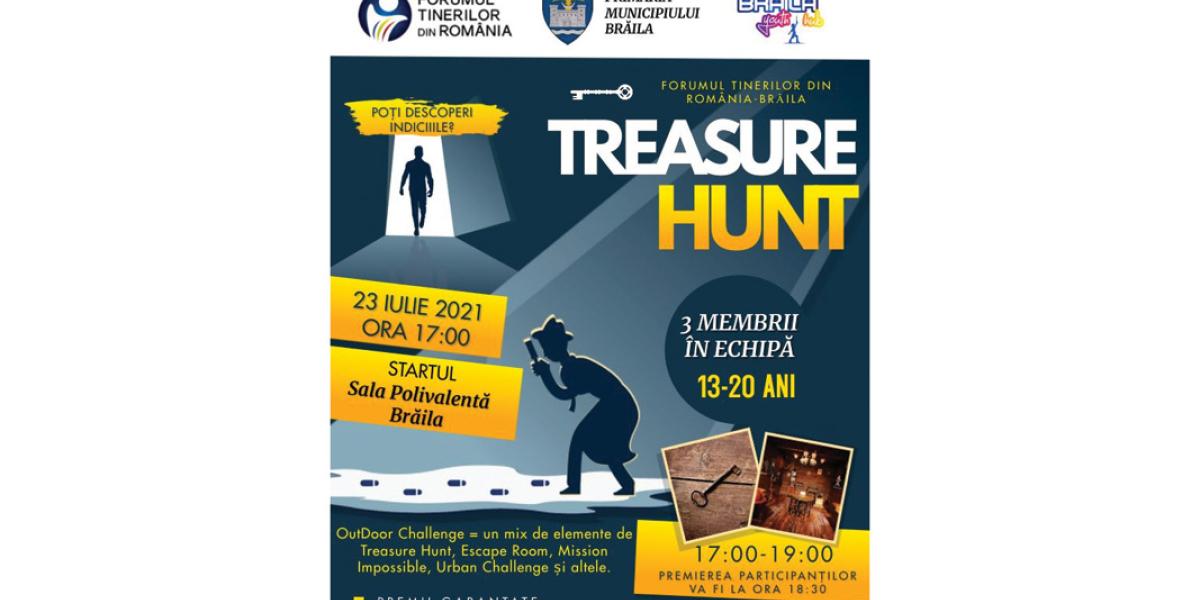 Forumul Tinerilor din România - Brăila, în parteneriat cu Primăria Municipiului Brăila și Centrul de Tineret - Brăila Youth Hub, organizează vineri, 23 iulie, între orele 17:00-19:00, o nouă vânătoare de comori. Evenimentul se numește “Treasure Hunt Brăila” și se va desfășura în Parcul Monument, fiind adresat copiilor și adolescenților.