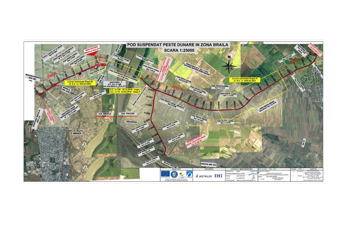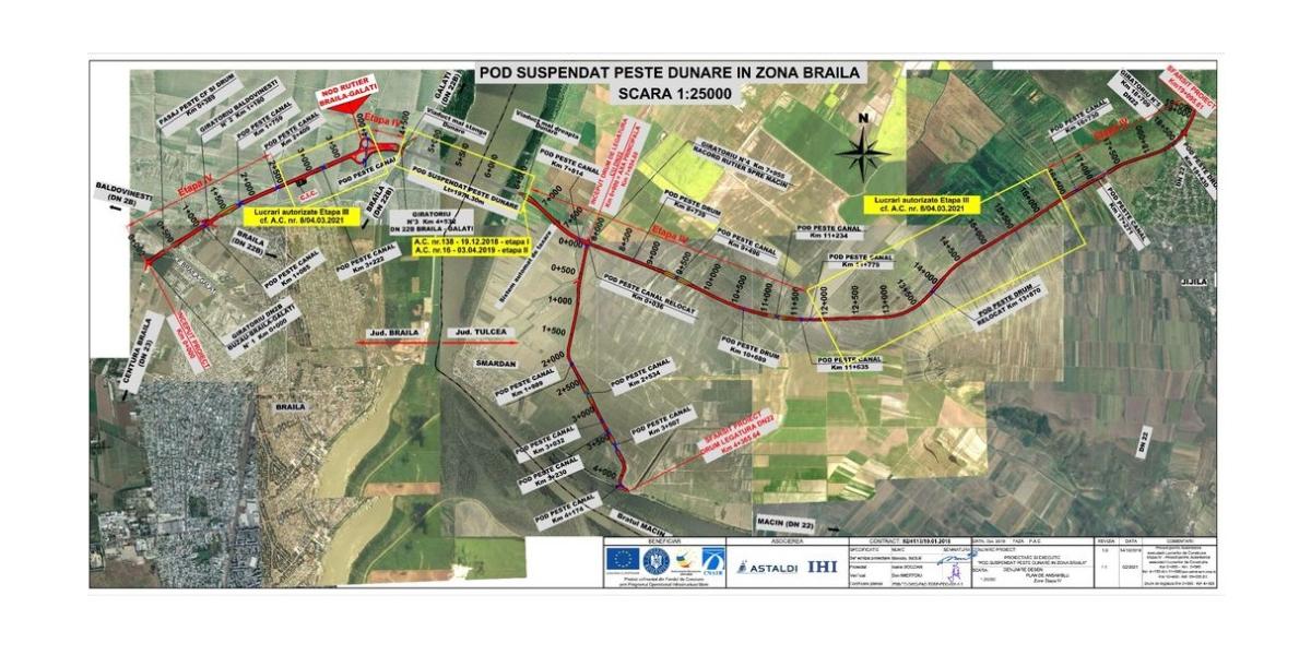 Podul suspendat va fi poziţionat între km 4+596,10 şi km 6+570,52, pe drumul principal Brăila - Jijila, respectiv la km 165+800 pe fluviul Dunărea (kilometraj pe Dunăre, măsurat de la Sulina)”, se mai specifică în comunicatul CNAIR.