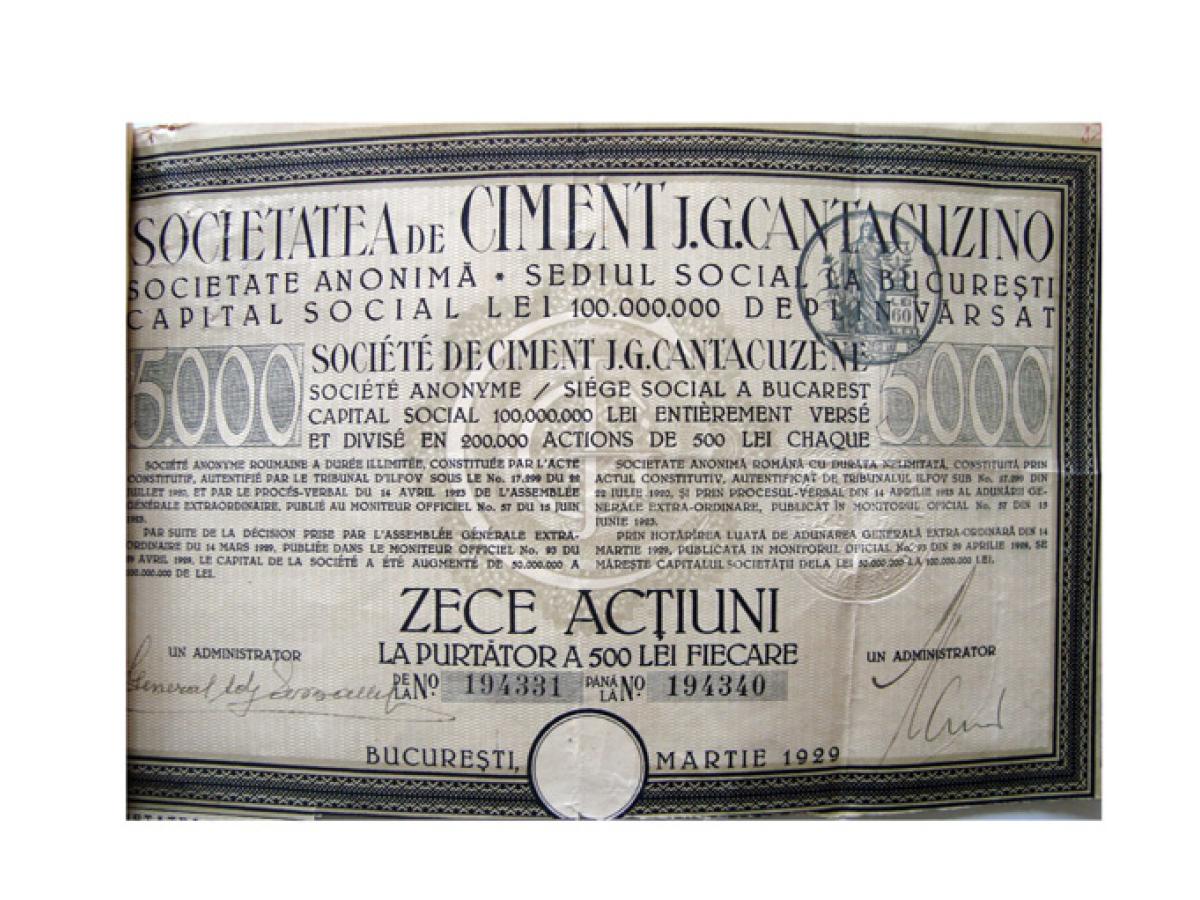 • medaliată cu argint la Expoziţia Universală de la Paris, din anul 1900, Fabrica „I.G.Cantacuzino” de la Brăila – prima fabrică de ciment din România – ar fi sărbătorit, anul trecut, 130 de ani de existenţă • în urmă cu 100 de ani, fabrica se întindea pe 52.000 mp, avea carieră de calcar de 100 de hectare în Dobrogea şi vindea peste 30.000 de tone de ciment Portland • în 1948, fabrica a fost naţionalizată forţat, iar comuniştii au pus la conducerea ei un muncitor şi i-au schimbat denumirea în „Stânca”