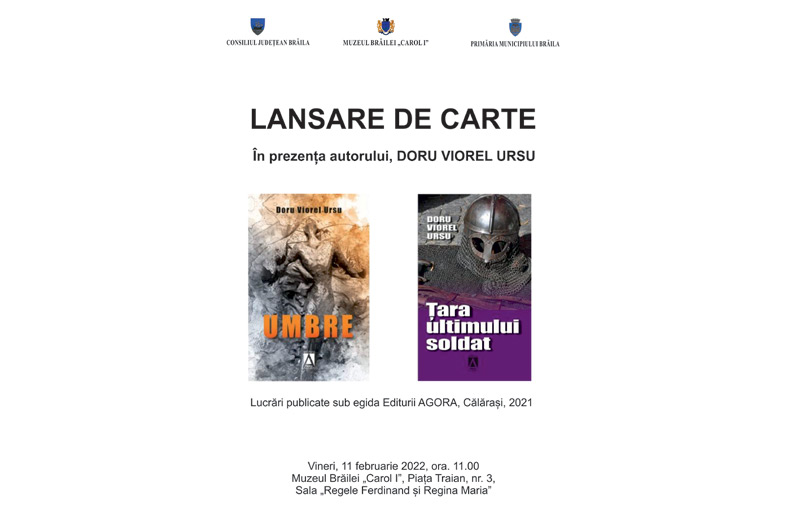 Astfel, potrivit unui comunicat al instituției brăilene de cultură, în ziua de vineri, 11 februarie, ora 11.00, are loc lansarea volumelor "Umbre" și "Țara ultimului soldat", în prezența autorului - Doru Viorel Ursu. Cunoscutul politician român, avocat și scriitor va fi prezent, vineri, la Muzeul Brăilei "Carol I". Evenimentul are loc în Sala "Regele Ferdinand I și Regina Maria", din Piața Traian nr. 3 (sediul central al muzeului) și va fi prezentat de dr. Viorel Mortu, cercetător la Muzeul Brăilei "Carol I". Potrivit instituției-gazdă, în cadrul evenimentului cultural se vor respecta normele în vigoare privind pandemia de Coronavirus (purtarea măștii de protecție, distanțare socială, dezinfectarea mâinilor).