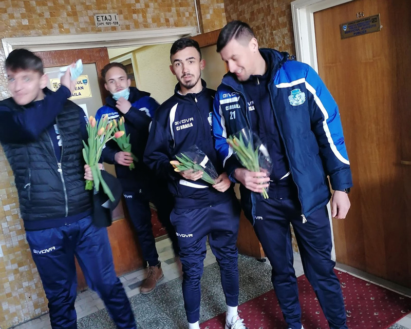 Fotbaliștii au trecut întâi pe la doamnele și domnișoarele de la Primărie și Consiliul Județean, iar apoi au oferit surprize plăcute și reprezentantelor sexului frumos întâlnite pe stradă.