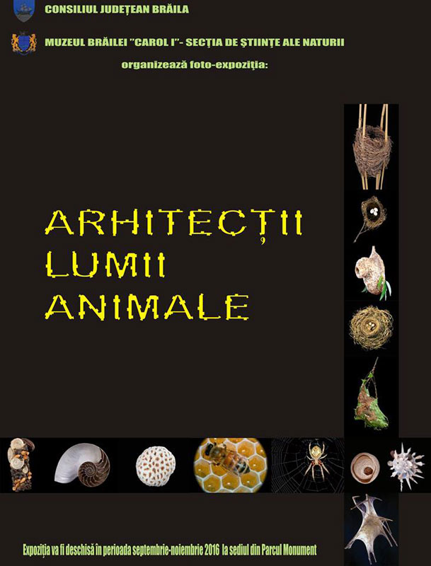 Din ultimele zile ale lunii septembrie şi până în noiembrie 2016, la Muzeul Brăilei „Carol I” – Secţia de Ştiinţe ale Naturii din Parcul Monument va fi deschisă foto-expoziţia „Arhitecţii lumii animale”.