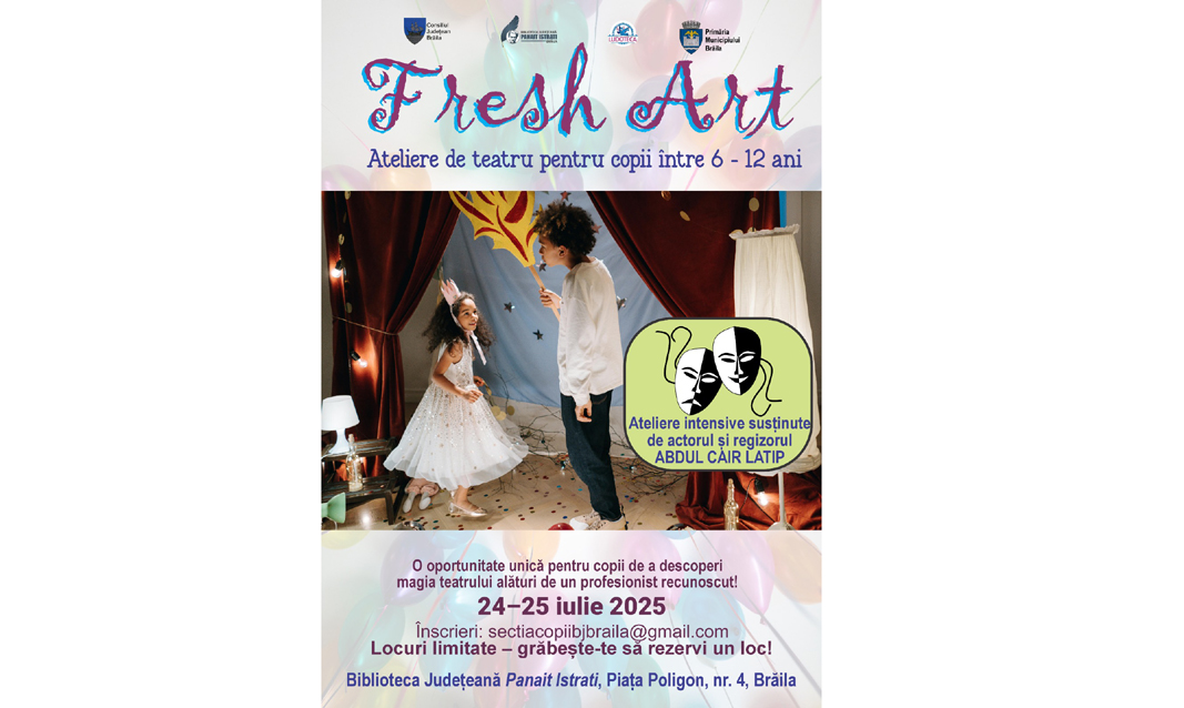 În perioada 24 - 25 iulie 2025, la Biblioteca Judeteana „Panait Istrati” Brăila - Secția de Împrumut pentru copii.Ludotecă, vor avea loc Atelierele FRESH ART de teatru pentru copii, cu Abdul Cair Latip, actor și regizor.