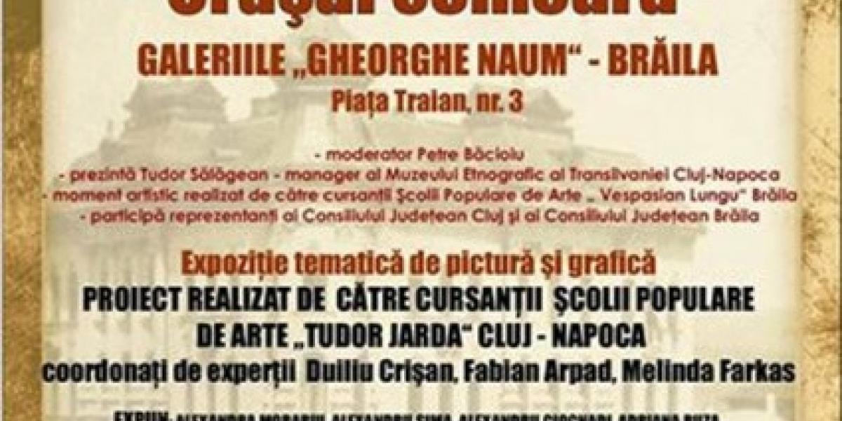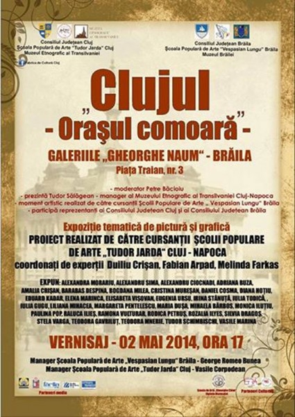 Galeriile "Gheorghe Naum" din Piaţa Traian, nr. 3, vor găzdui, vineri, 2 mai, de la ora 17.00, vernisajul expoziţiei "Clujul - oraşul comoară". Evenimentul este organizat de Consiliul Judeţean Brăila, Consiliul Judeţean Cluj, Şcoala Populară de Arte "Vespasian Lungu" Brăila, Şcoala Populară de Arte "Tudor Jarda" Cluj-Napoca, Muzeul Brăilei şi Muzeul Etnografic al Transilvaniei. Vor participa reprezentanţi ai instituţiilor implicate, precum şi din partea Consiliilor Judeţene Brăila şi Cluj. În cadrul vernisajului va avea loc şi un moment artistic susţinut de către elevii Şcolii de Arte "Vespasian Lungu" Brăila.