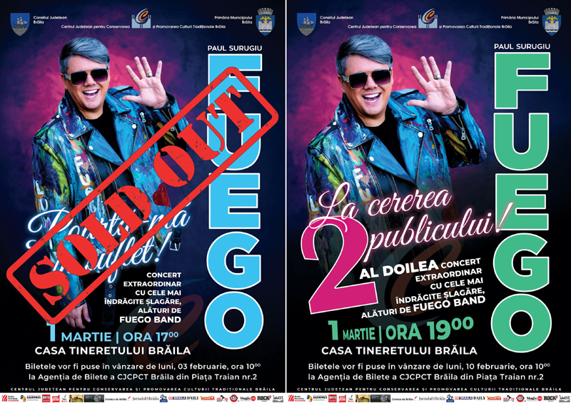 Pe 1 martie, la Casa Tineretului, Paul Surugiu - Fuego va susține două concerte, la ora 17:00 și la ora 19:00, împreună cu a sa „Fuego Band”. Puse în vânzare pe 3 februarie, la Agenția de Bilete a Centrului Județean pentru Conservarea și Promovarea Culturii Tradiționale (Centrul de Creație) Brăila, din Piața Traian nr. 2, biletele pentru primul concert s-au epuizat rapid. Biletele pentru cel de-al doilea concert Fuego au fost puse în vânzare începând de ieri, luni, 10 februarie. După cum ne-a declarat conducerea Centrului de Creație, ieri după-amiază încă mai erau disponibile bilete.