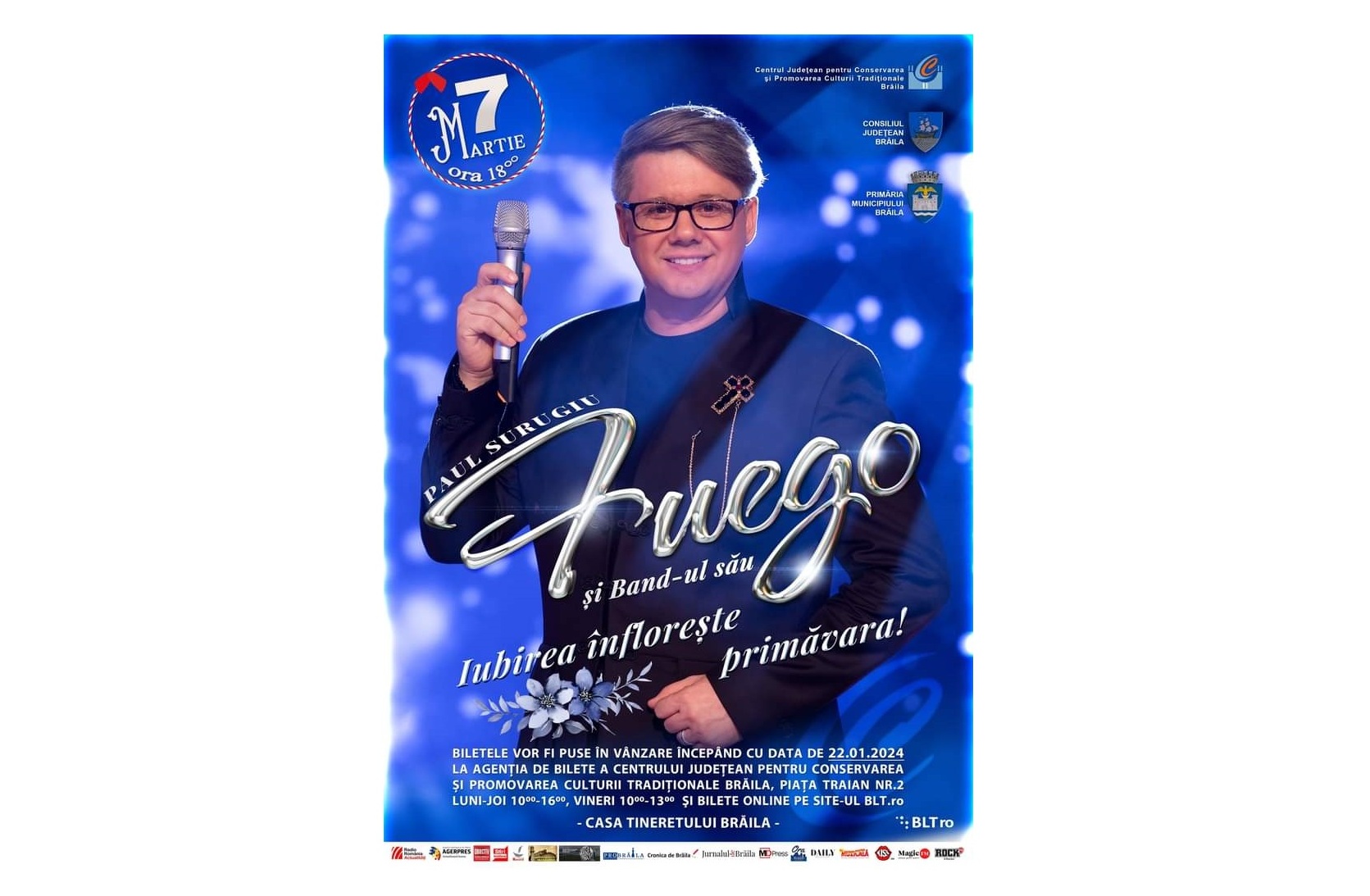 Astfel, Consiliul Județean Brăila, prin Centrul Județean pentru Conservarea și Promovarea Culturii Tradiționale (Centrul de Creație) și Primăria Municipiului Brăila organizează, în ziua de 7 martie 2024, concertul „Iubirea înflorește primăvara!”, un emoționant regal de muzică, „o întâlnire de suflet a artistului apreciat și aplaudat la scenă deschisă cu fiecare apariție a sa, Paul Surugiu-Fuego, cu publicul iubitor de frumos, de muzică, artă și poezie, pe versuri nemuritoare ce vor scrie istorie - un concert de o sensibilitate aparte”.