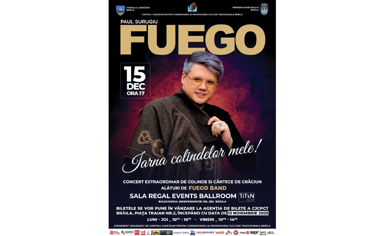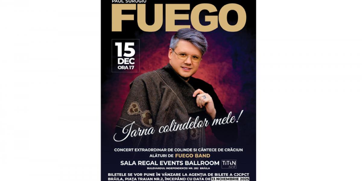 Evenimentul va avea loc la Sala Regal Events Ballroom (B-dul Independenței nr. 282), iar îndrăgitul interpret va evolua alături de a sa „Fuego Band”. Potrivit organizatorilor, biletele pentru concertul lui Fuego s-au pus în vânzare începând de joi, 13 noiembrie, la Agenția de bilete a Centrului de Creație Brăila, din Piața Traian nr. 2, sau online. Prețul unui bilet la concertul de colinde al lui Fuego este de 68,90 lei.
