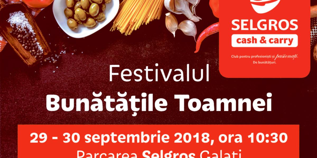 Cel mai mare festival de toamnă din zona Galaţi-Brăila-Focşani, dedicat bucatelor de toamnă, va avea loc în weekend-ul 29-30 septembrie, în parcarea Selgros Galaţi. Festivalul “Bunătăţile Toamnei” dă startul bunei dispoziţii, sâmbătă, 29 septembrie, la ora 10.30, şi propune publicului o serie de evenimente interesante şi bucate delicioase. Timp de 2 zile, parcarea magazinului Selgros - organizatorul evenimentului - va găzdui cele mai bune bucate, muzică live cu personalitate, socializare şi multe surprize.