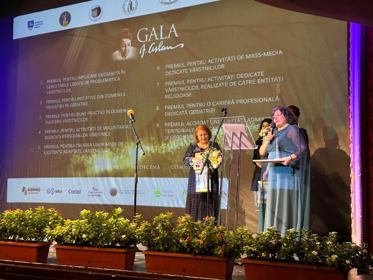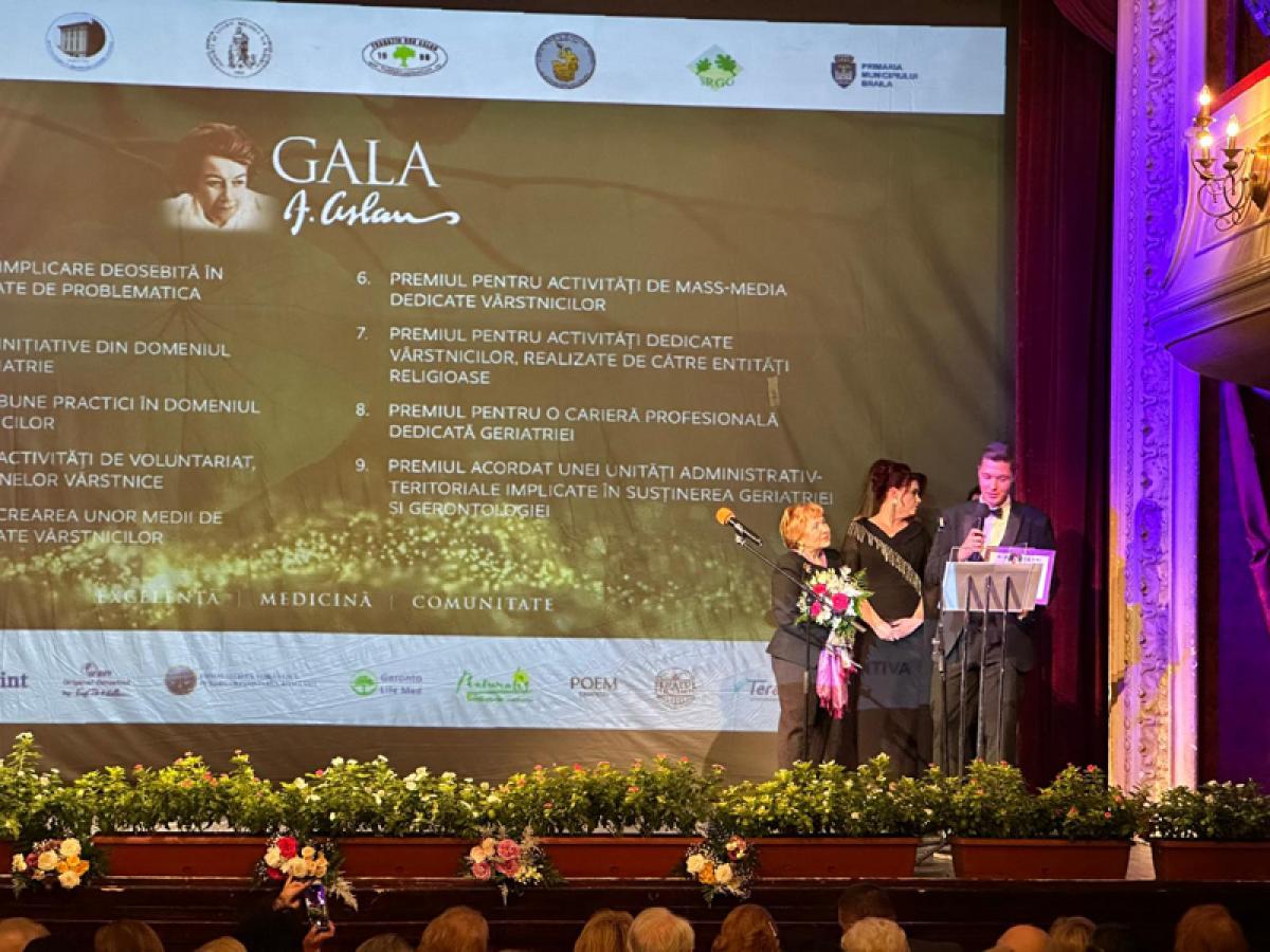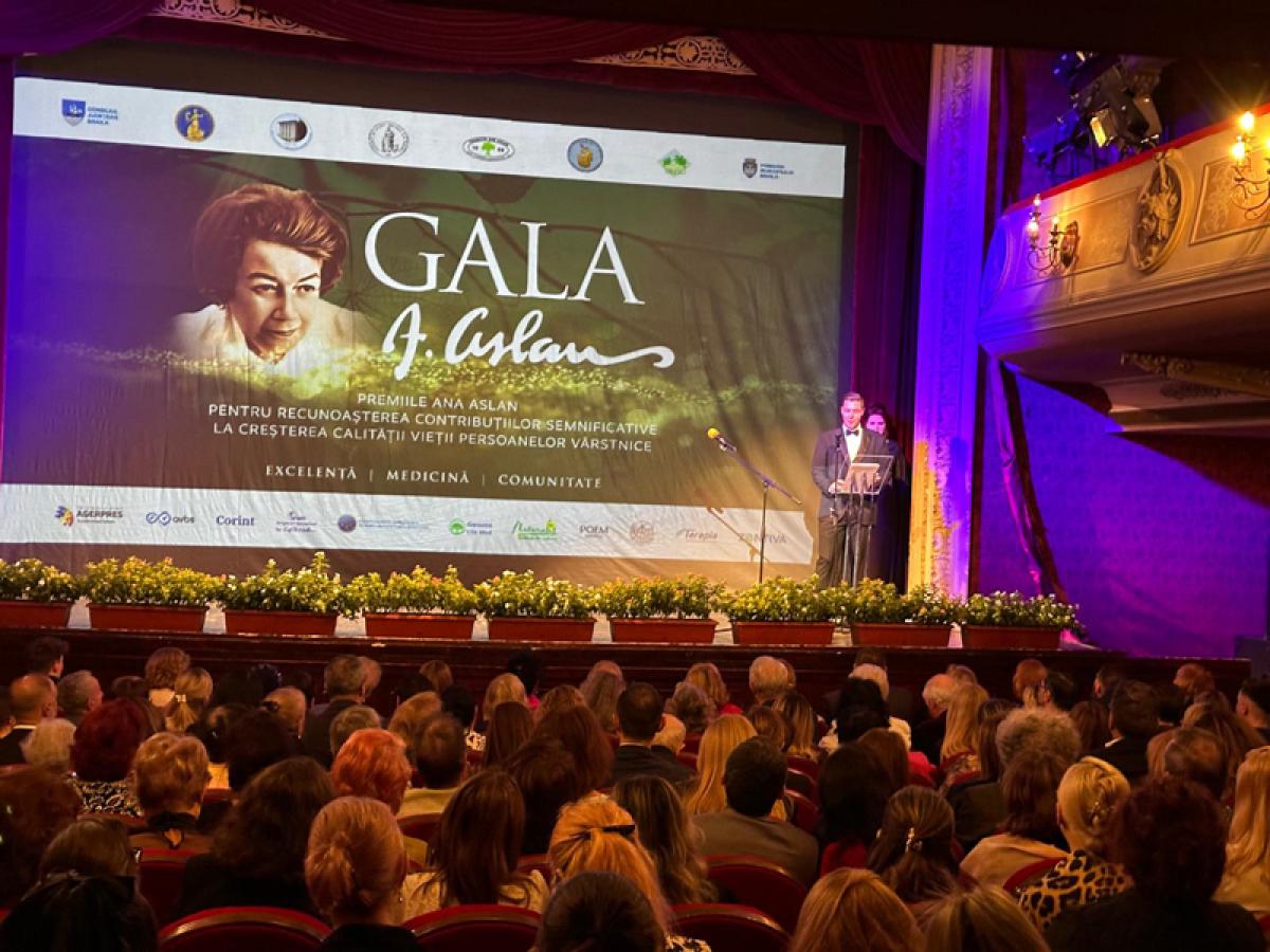 • Brăila, orașul natal al savantei Ana Aslan, a găzduit sâmbătă, 11 octombrie, la Teatrul ”Maria Filotti”, cea de-a doua ediție a Galei ”Ana Aslan”, un eveniment de înaltă ținută științifică organizat de Fundația ”Ana Aslan”, în parteneriat cu Primăria Municipiului Brăila • Gala a reunit personalități din lumea medicală, academică și diplomatică, premiind excelența în geriatrie, gerontologie și știința longevității
