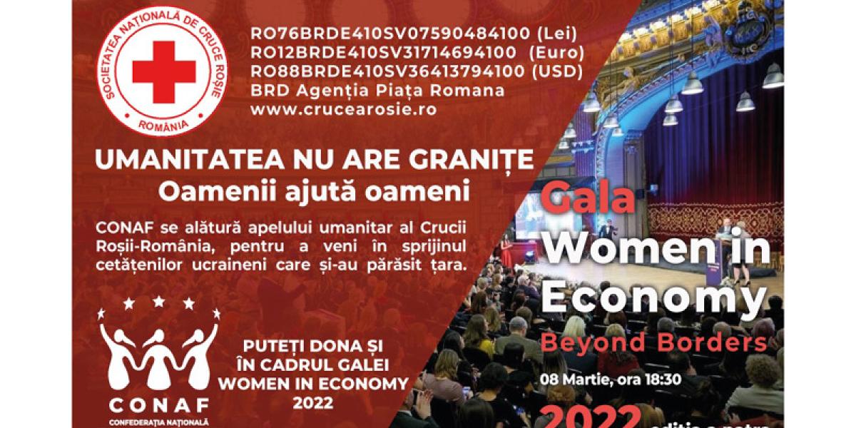 Gala Confederației Naționale pentru Antreprenoriat Feminin – CONAF: „Women in Economy. Beyond Borders” din acest an, transcede granițele țării și ne arată lecția solidarității și umanității în contextul actual al războiului din Ucraina.