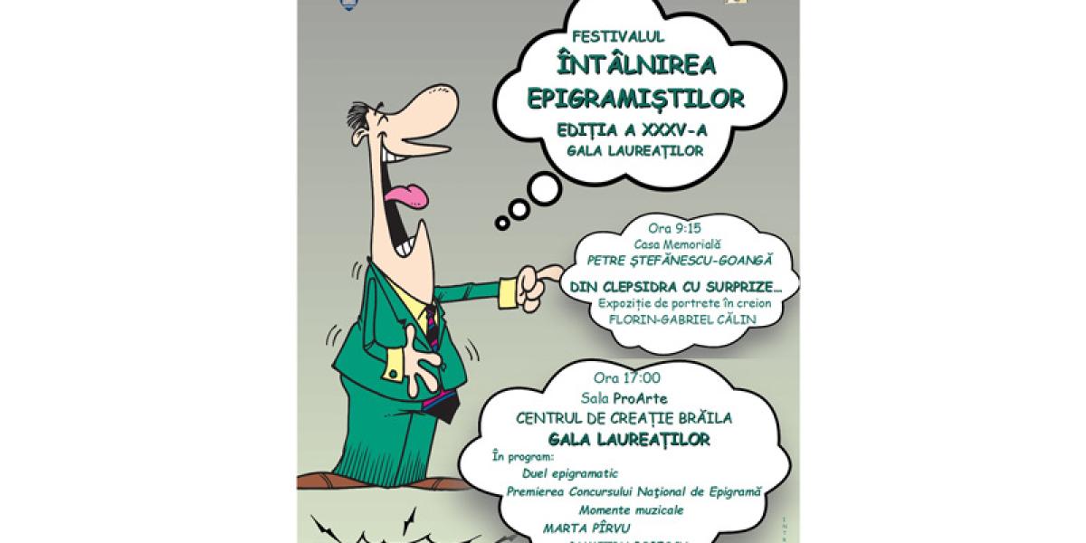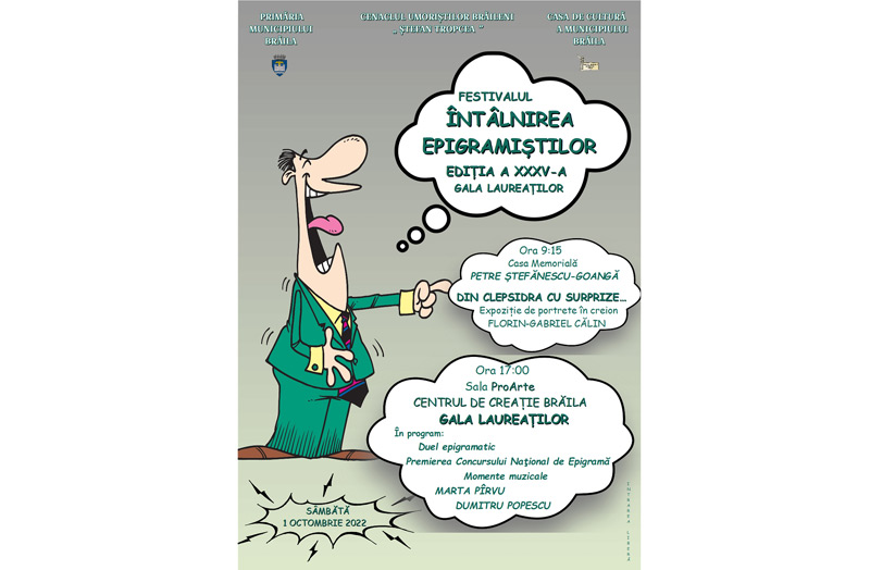 Eveniment cultural de excepție în weekend. Sala ProArte a Centrului de Creație Brăila va găzdui sâmbătă, 1 octombrie 2022, începând cu ora 17.00, Gala Laureaților celei de a XXXV-a ediție a Festivalului Concurs Internațional "Întâlnirea epigramiștilor", manifestare organizată de Casa de Cultură a Municipiului Brăila și Clubul Umoriștilor Brăileni (CUB) "Ștefan Tropcea".