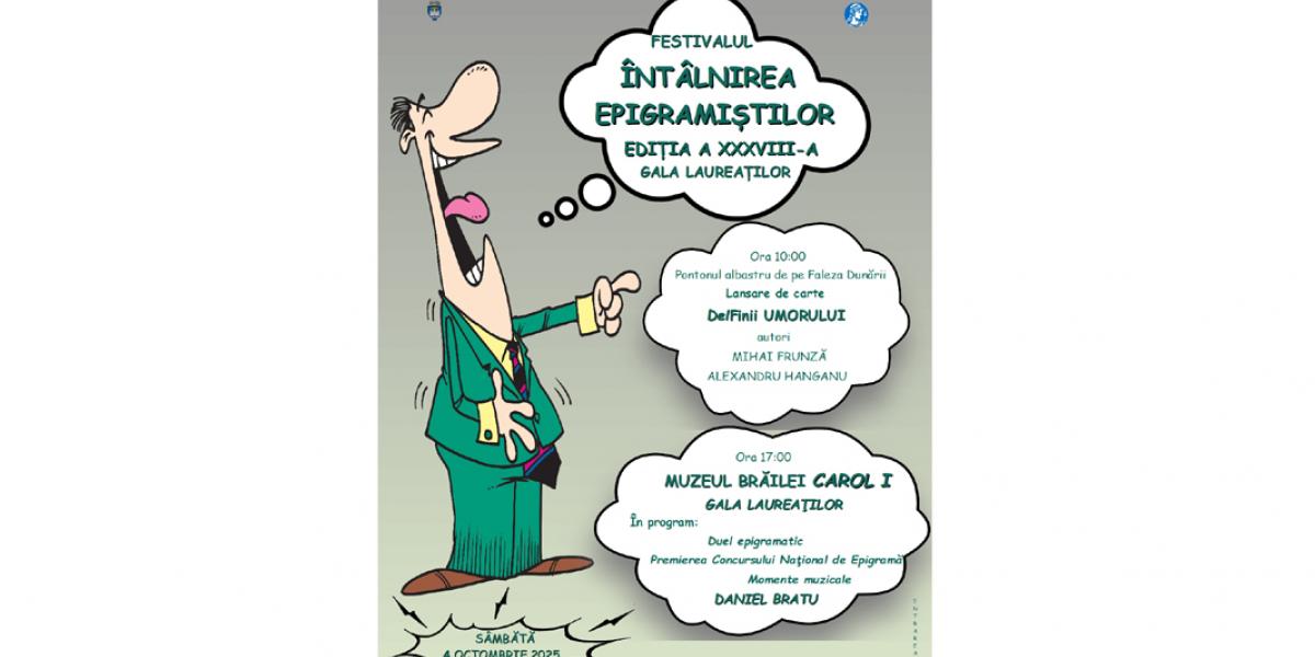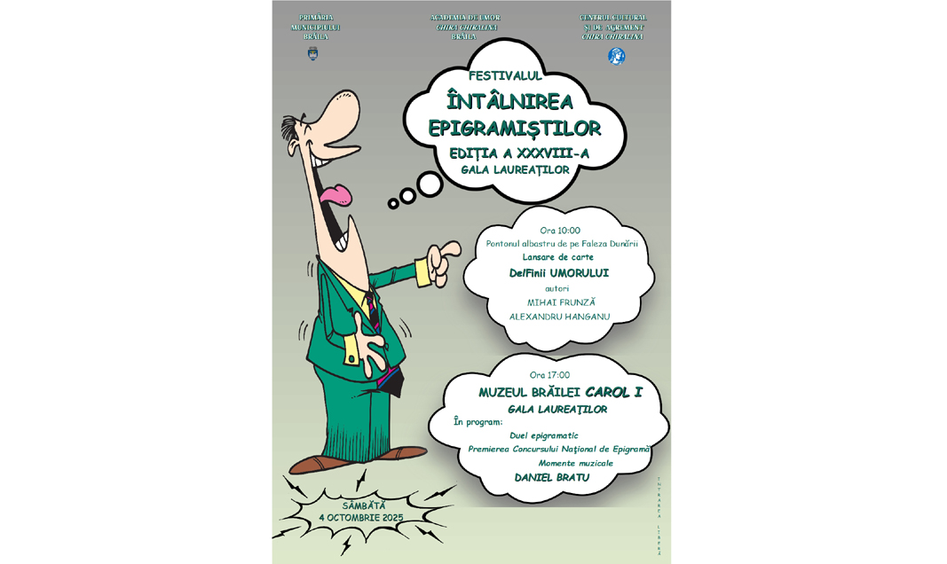 Sâmbătă, 4 octombrie, Brăila găzduiește un eveniment cu adevărat savuros: Gala Laureaților Festivalului-Concurs „Întâlnirea Epigramiștilor”, ediția cu numărul XXXVIII. Potrivit managerului Centrului Cultural și de Agrement „Chira Chiralina”, Emanoil Ciucașu, începând cu ora 17:00, la Sala „Regele Ferdinand I și Regina Maria” a Muzeului Brăilei „Carol I”, din Piața Traian nr. 3, se strâng cei mai buni epigramiști din România și nu numai, gata să aducă zâmbete pe chipurile spectatorilor și să fie răsplătiți cu ropote de aplauze.