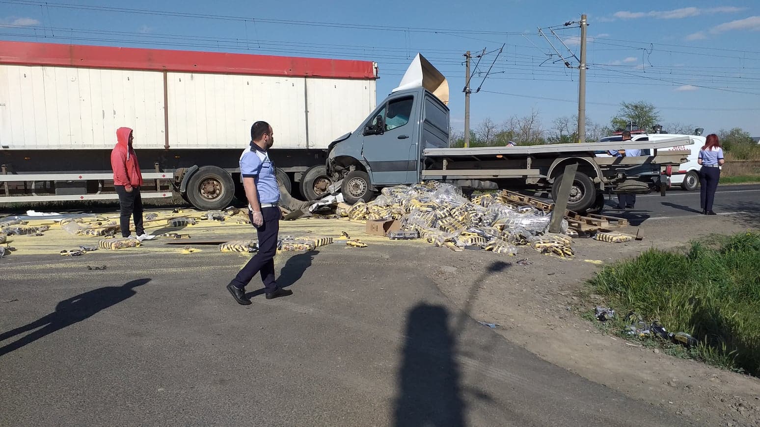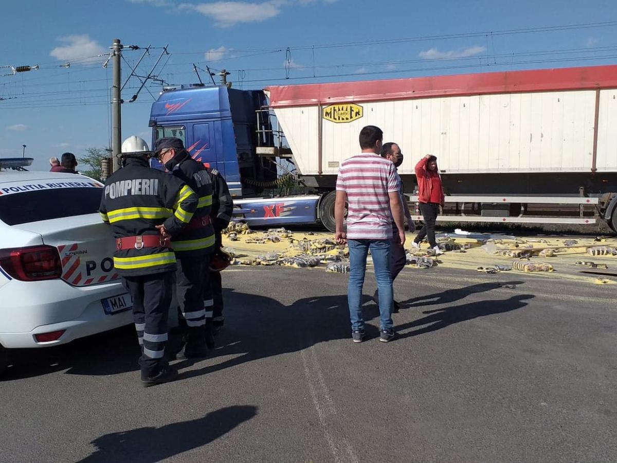 ȘTIRE INIȚIALĂ Un accident rutier în care au fost implicate trei TIR-uri s-a produs, luni după-amiază, la intrare în localitatea Baldovineşti, pe DN 2B. Din primele date obţinute de la faţa locului, şoferul unei furgonete transporta mălai şi venea de la Huşi, mergând către localitatea Cazasu. Într-o curbă aflată la intrare în Baldovineşti, şoferul ar fi pierdut controlul volanului, cel mai probabil pe fondul neadaptării vitezei, ajungând pe contrasens. Acesta a lovit două TIR-uri care veneau din sens opus. Se pare că a rezultat şi o victimă, şoferul unuia dintre autotrenurile lovite ajungând la spital.