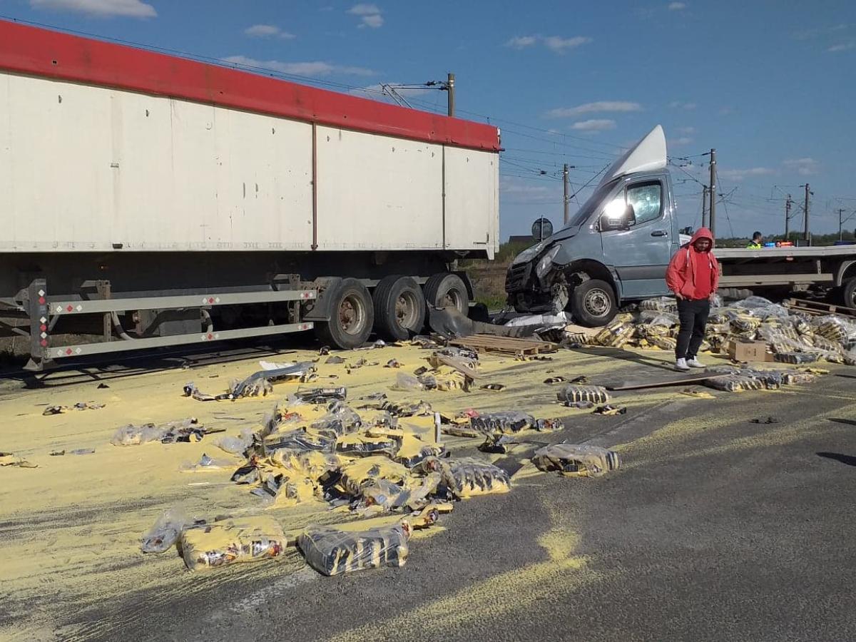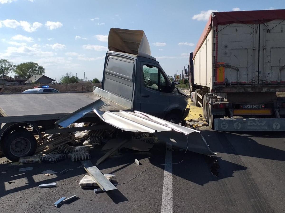 UPDATE În urma cercetărilor efectuate la fața locului, Poliția a stabilit că, luni, la ora 16:15, un tanar, în vârstă de 29 de ani, din Braila, în timp ce conducea o autoutilitara pe DE 87, pr raza localității Baldovinești, dinspre localitatea Sendreni catre municipiul Brăila, ar fi pierdut controlul asupra vehiculului si ar fi patruns pe contrasens, intrand in coliziune cu un TIR, condus de către un barbat, în vârstă de 45 de ani, din judetul Constanta. In urma impactului, autoutilitara a ricosat intr-un al doilea TIR, care circulă tot pe sensul opus de mers. A rezultat vătămarea corporală usoara a soferului de 45 de ani, care a fost transportat la spital pentru acordarea de îngrijiri medicale, rămânând internat. Soferii implicați au fost testati cu aparatul alcooltest, rezultatul fiind 0. In cauza a fost intocmit dosar penal pentru vătămare corporală din culpă și se continua cercetarile in vederea stabilirii cu exactitate a cauzelor care au condus la producerea accidentului. Traficul în zona este blocat, fiind deviat de către polițiști pe rute ocolitoare.