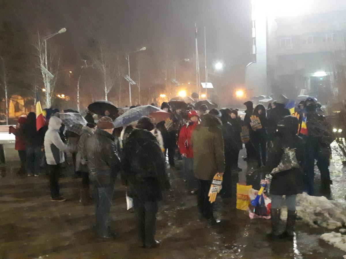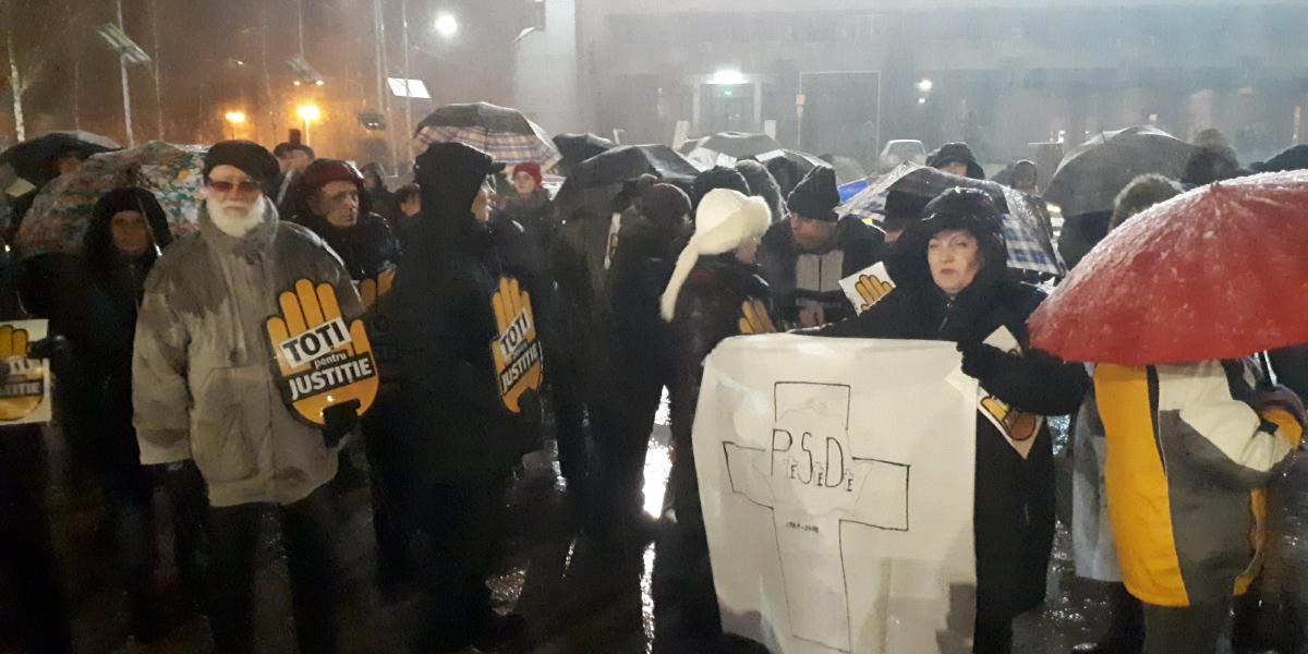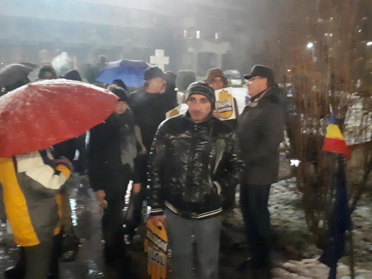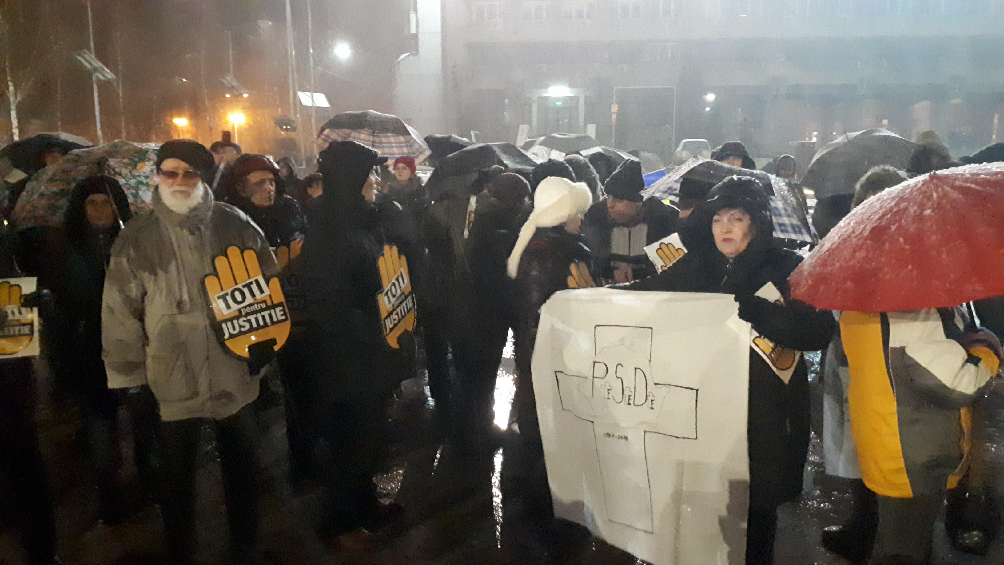 Protestatarii sunt dotați cu pancarte și vuvuzele și scandează lozinci de susținere a Justiției și împotriva PSD și Liviu Dragnea. Ei și-au propus ca, după ce se vor strânge ceva mai mulți să pornească și într-un mars.