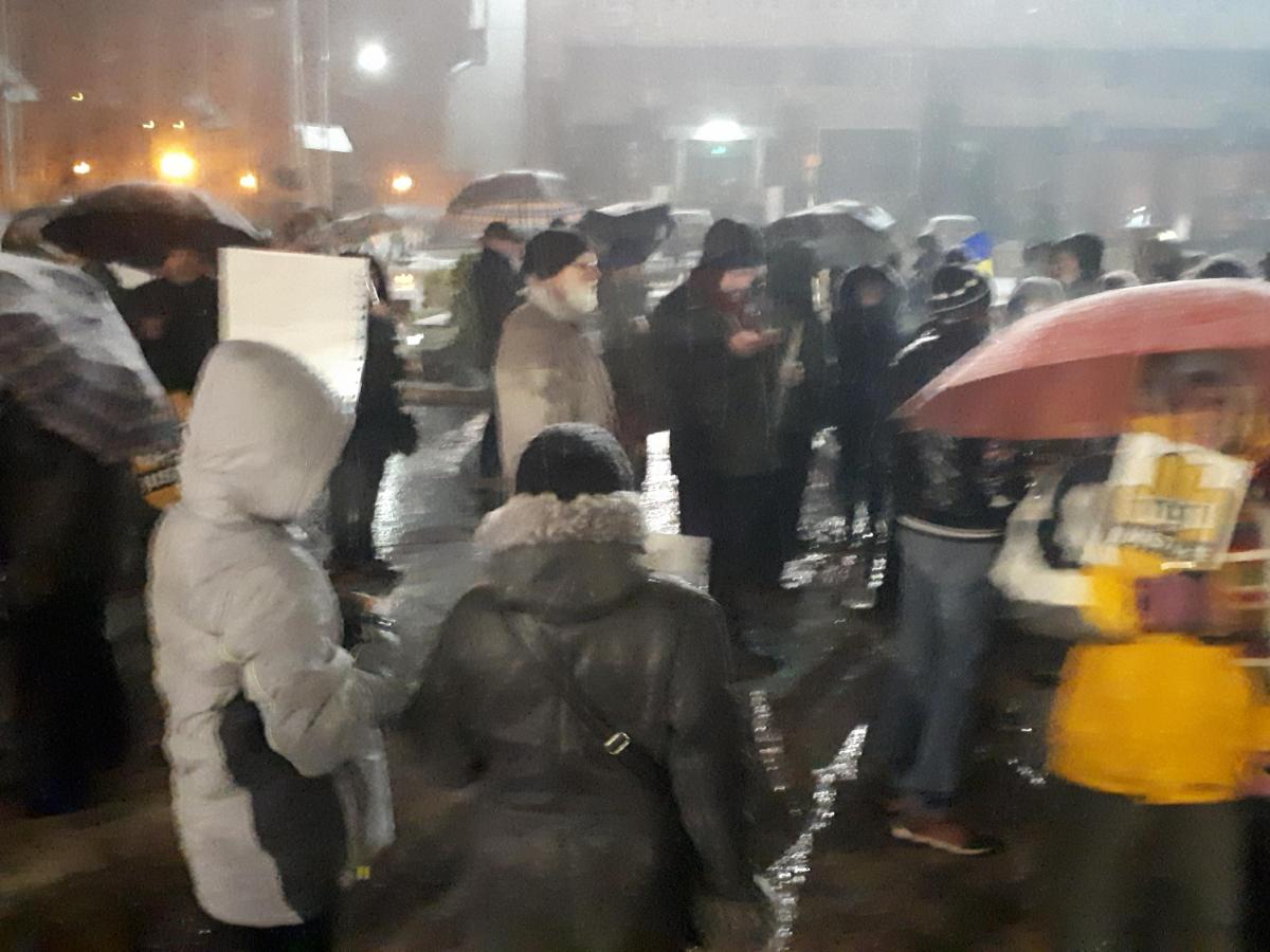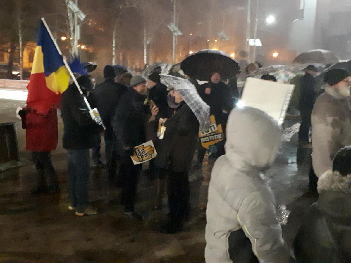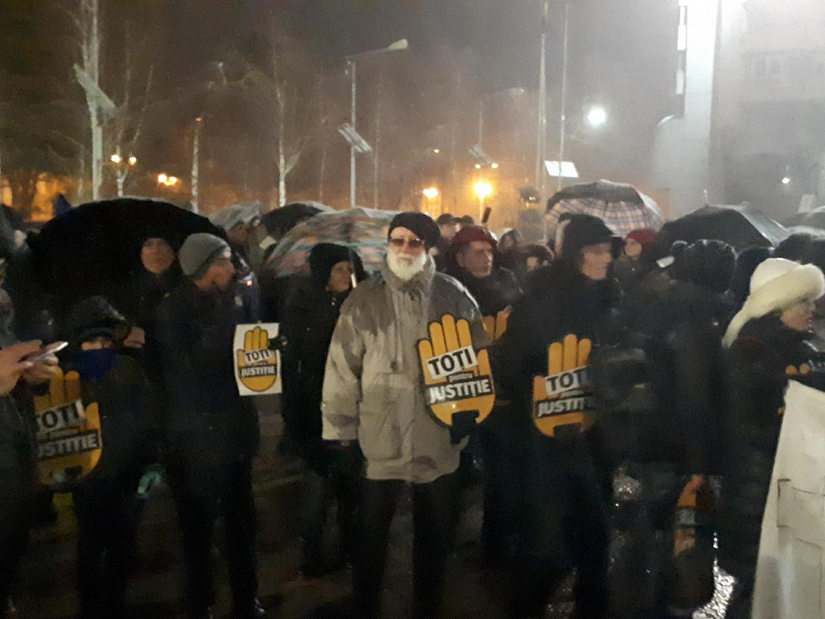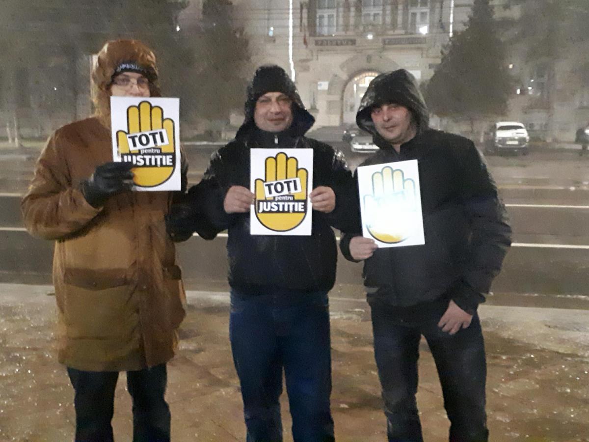 Protestatarii sunt dotați cu pancarte și vuvuzele și scandează lozinci de susținere a Justiției și împotriva PSD și Liviu Dragnea. Ei și-au propus ca, după ce se vor strânge ceva mai mulți să pornească și într-un mars.