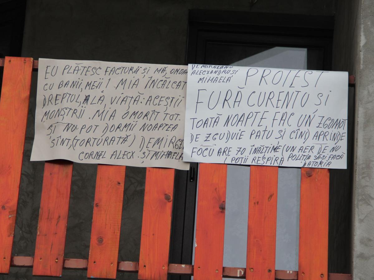 Reclamanta i-a spus reporterului care s-a deplasat la fața locului că, de mai bine de doi ani, nu mai poate trăi liniștită din cauza vecinului său. Ea s-a plâns de amenzile pe care i le dă Poliția, pe motiv că face sesizări, asta în condițiile în care vecinul nu ar fi tras la răspundere. “Nu știu ce face acolo, de trei ani de zile mă chinuie, fură curentul, pe spinarea noastră. Dar tot mie mi-au dat amendă, una de 1.000 lei, alta de 2.000 lei, pe urmă o scrisoare cu 76 de amenzi. Poliția mi-a dat și când am fost la ANAF să văd și eu ce scrie în ele, cică este sigilat și nu am voie. Păi, nu trebuie să știu de ce m-a amendat!? Porcul mi l-a omorât de Crăciun, curcile mi le-a omorât, păsările mi le-a omorât, m-a bătut de două ori, m-a făcut curvă, zdreanță, vagaboandă... toate prostiile îmi spune, mă batjocorește.