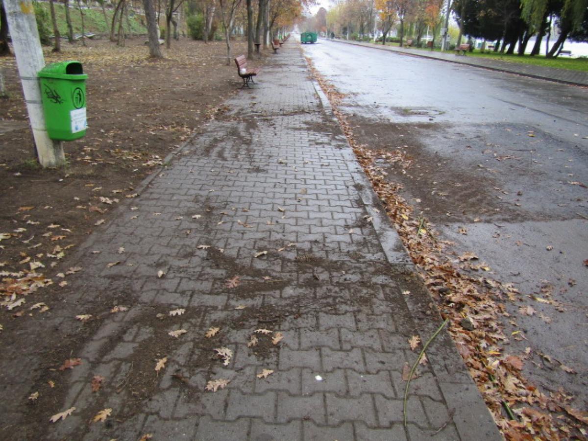 Altceva era însă în neregulă, iar aceasta este o veche meteahnă la “spaţii verzi”: dârele nesfărşite de pământ rămas pe trotuar şi transformate în noroi deoarece curăţenia finală se face mai mult din lama buldozerului, care lasă făgaşe pe terenul desţelenit şi roţile duc noroiul tot pe trotuar. Fapt ce provoacă nu doar disconfort trecătorilor, dar şi pericolul de alunecare. Plus că nici salubriştilor nu le convine acest aspect: “Uite mata, trebuie să le cureţi în urmă şi uneori mai aruncă şi pietre în coşurile de gunoi… Eu lucrez pe faleză la curăţenie de 10 ani, iar acum strâng frunzele ude cu picioarele, că ai noştri n-au venit cu maşina de aspirat, când erau uscate… Chinu’ după lume, că mai sunt şi bolnavă de inimă”, ne-a spus o lucrătoare de la Salubritate.