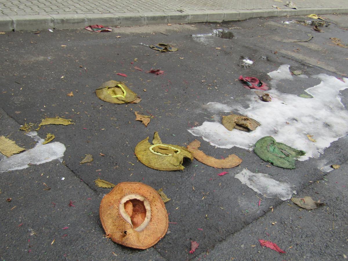 Pe sensul opus de circulație, lângă taluzul falezei, alte surprize nedorite: pălării de paie distruse de viscol și împrăștiate pe jos, o albie din plastic făcută praf, o anvelopă auto, iar sus, pe taluz, stau aruncate două șezlonguri. Probabil de la una din vilele sau casele care au ocupat aleea pietonală de pe promontoriul falezei. Când au fost “arborate” la înălțime o multitudine de pălării multicole din paie, trecătorii spuneau admirativ “jos pălăria”. Din păcate însă, aceste pete de culoare au ajuns, nedorit, să fie deteriorate și căzute la pământ din cauza fenomenului previzibil al viscolului. Deci, jos pălăriile, la propriu.