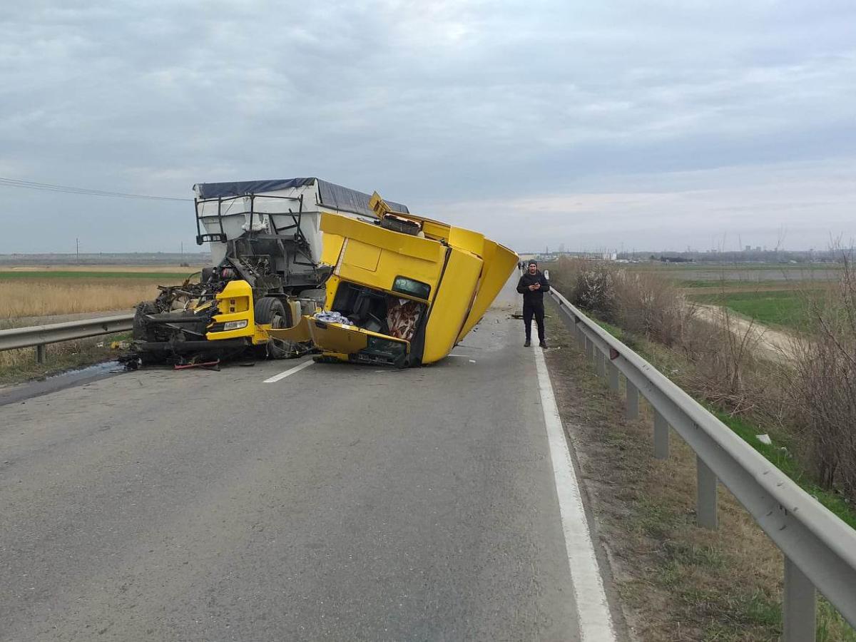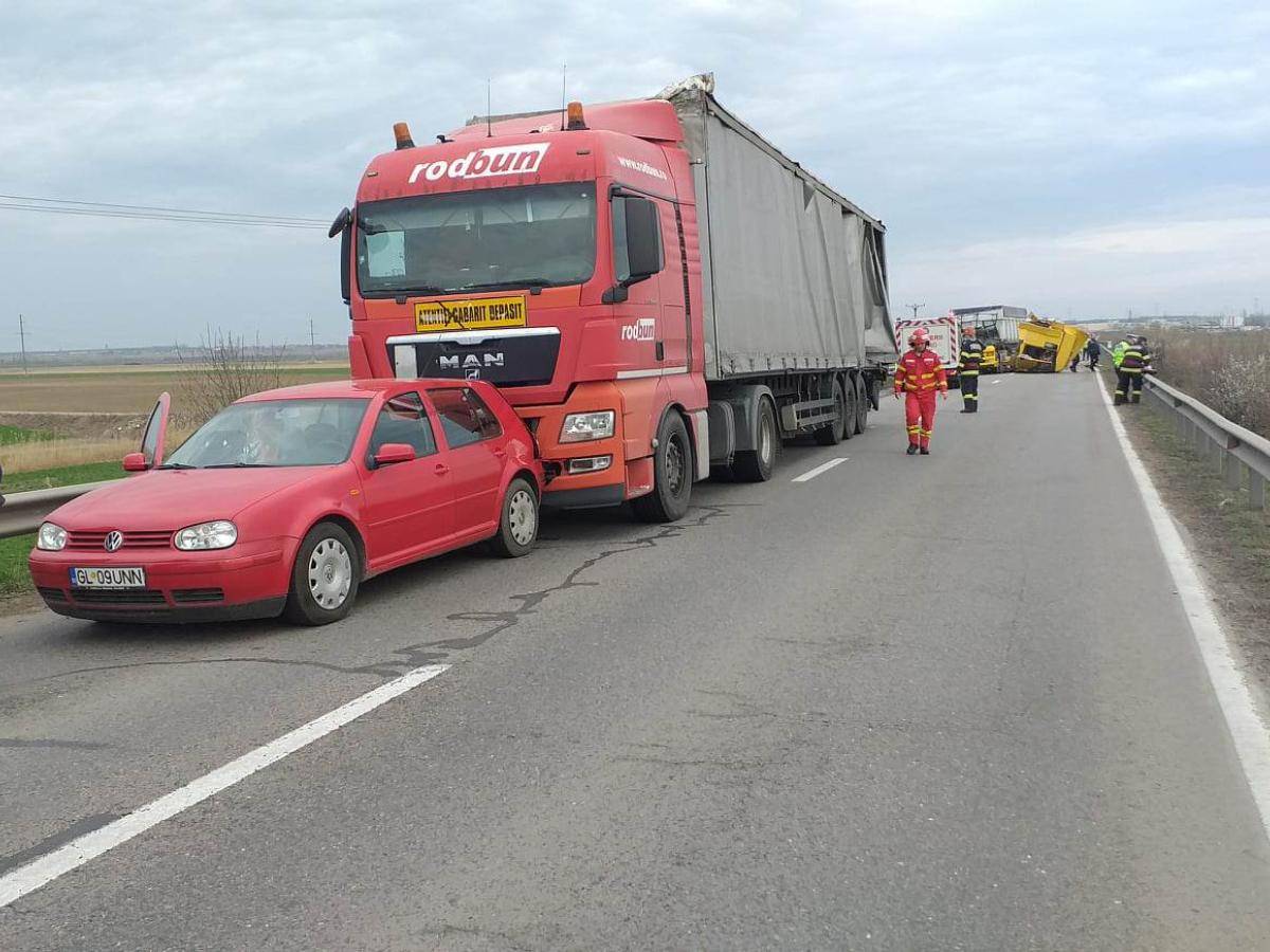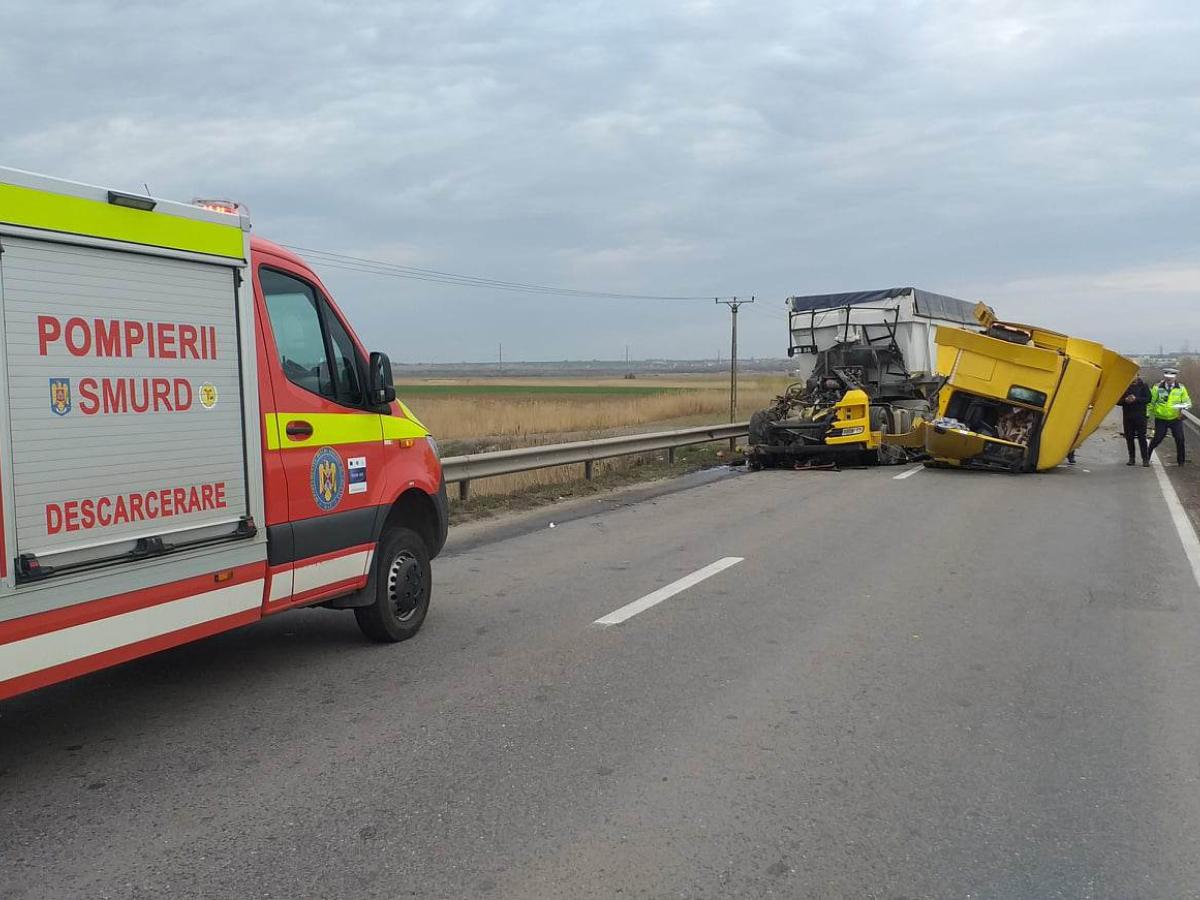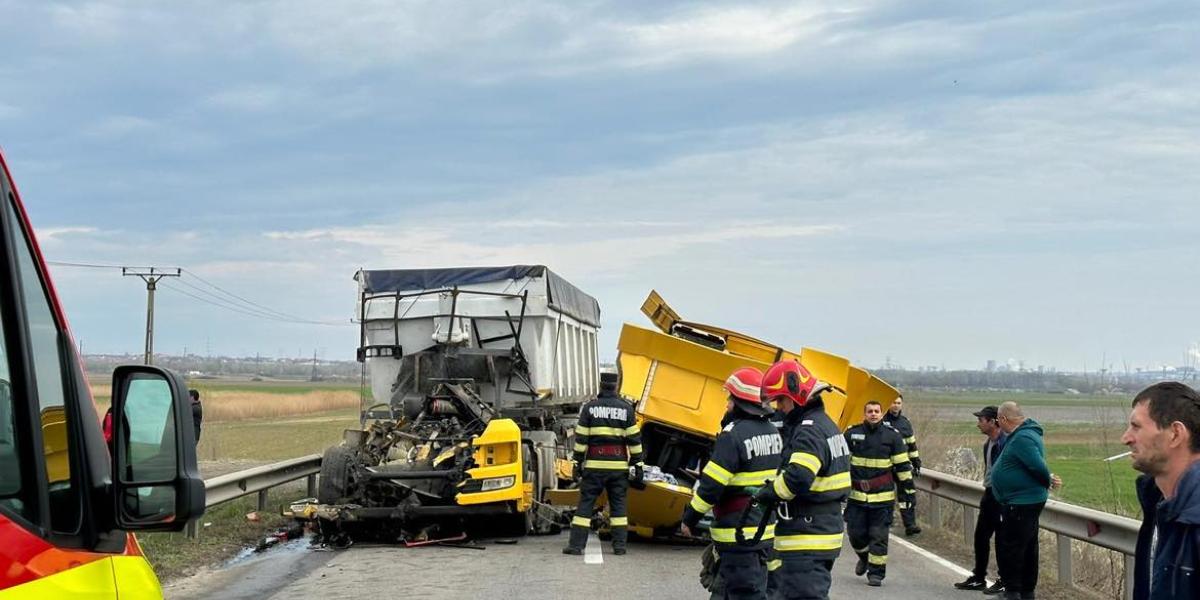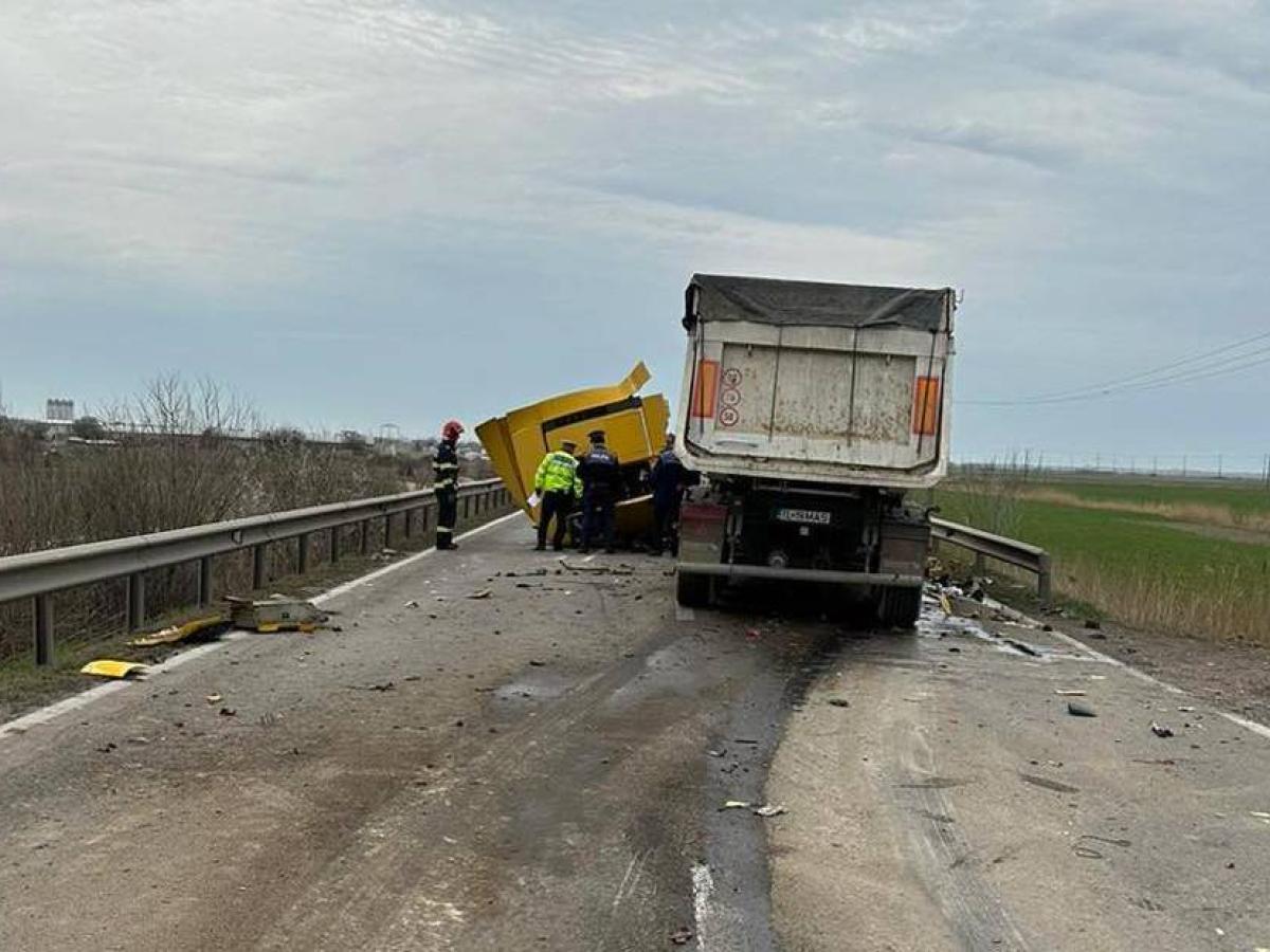 * după impactul violent dintre cele două autotrenuri, TIRul lovit s-a dezmembrat și a întrat în autoturismul care circula în faţa sa * pasagerul din primul TIR, un bărbat în vârstă de 44 de ani, din județul Tulcea, a fost preluat de un elicopter SMURD