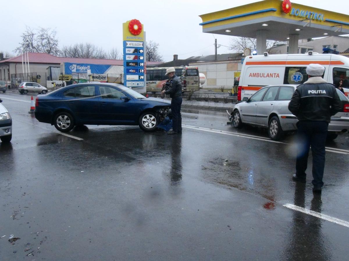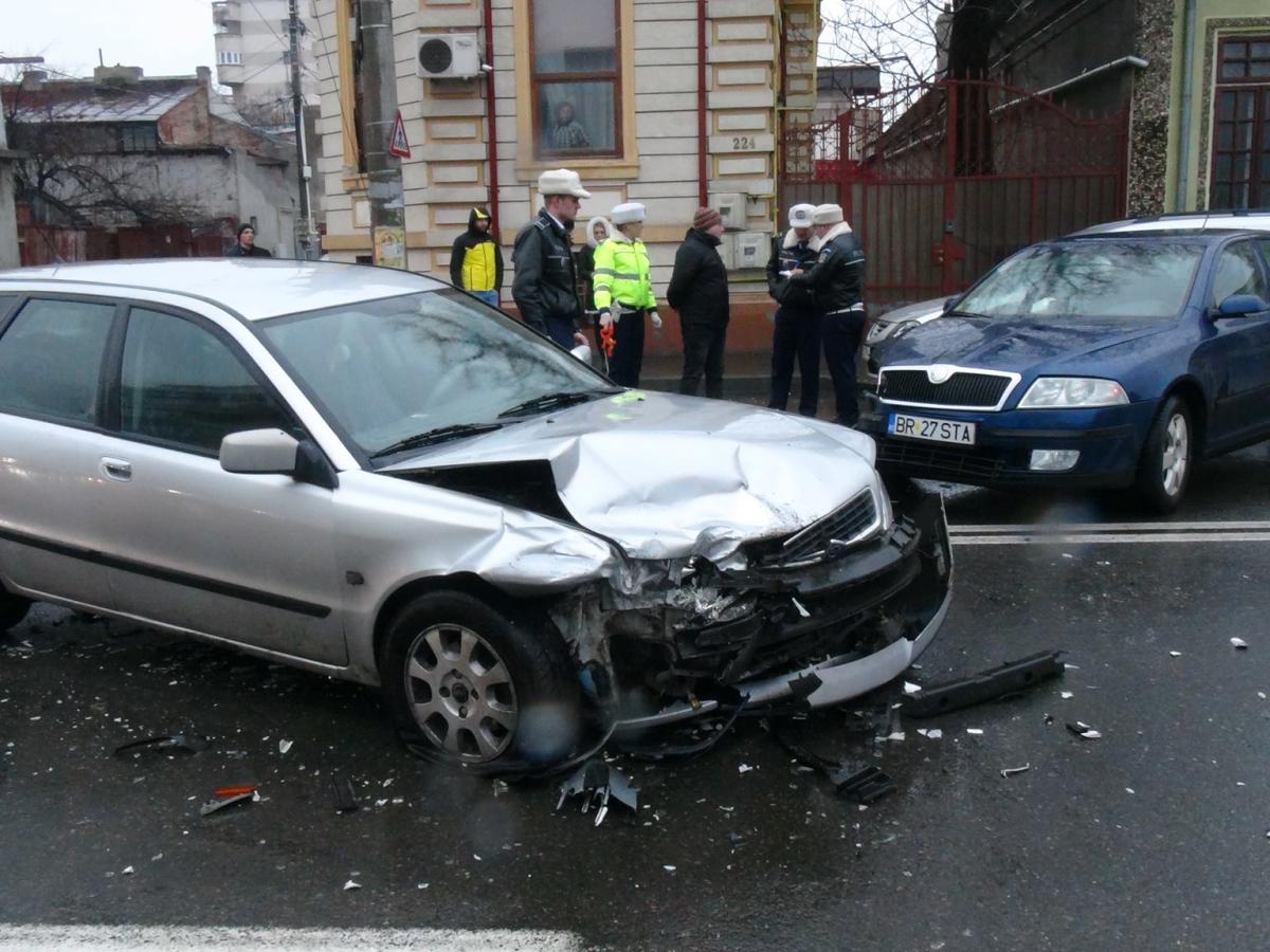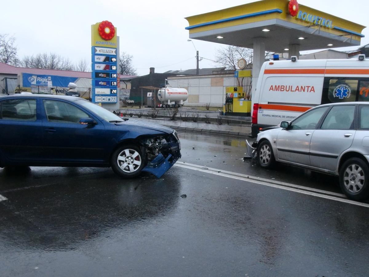 Un șofer de 27 ani, din Brăila, care circula la volanul unui autoturism Skoda, pe Griviţa, de la Şcolilor către str. 1 Decembrie, a virat stânga pentru a intra în stația peco Rompetrol, fără a acorda prioritate unui autovehicul Volvo care venea din sens opus.