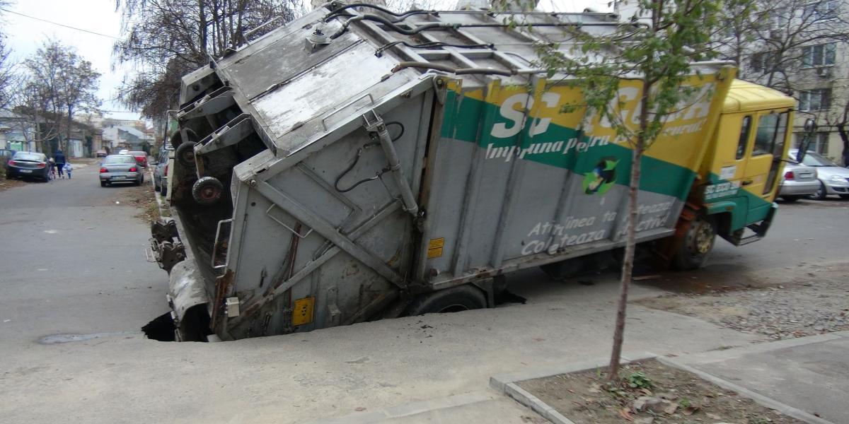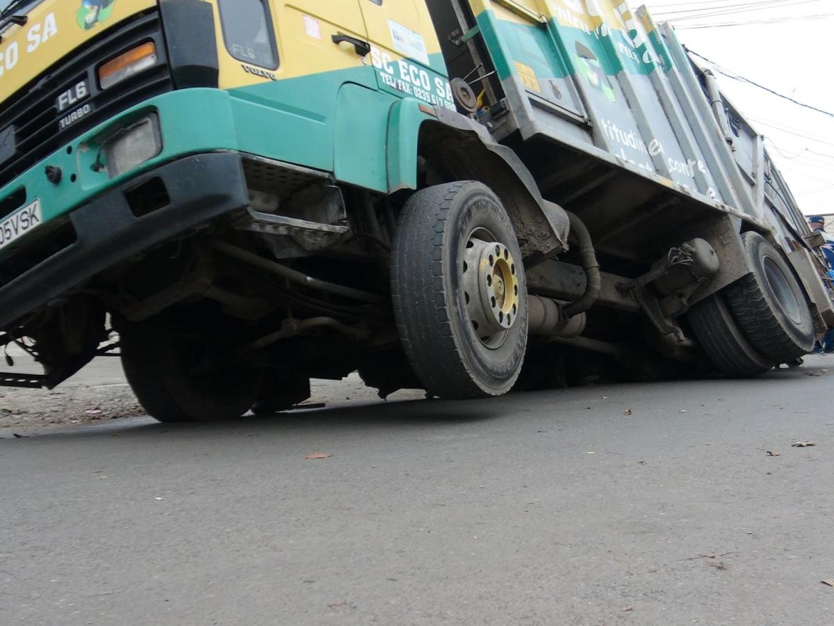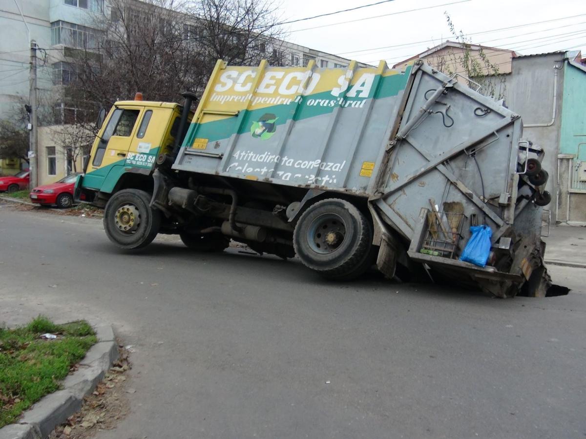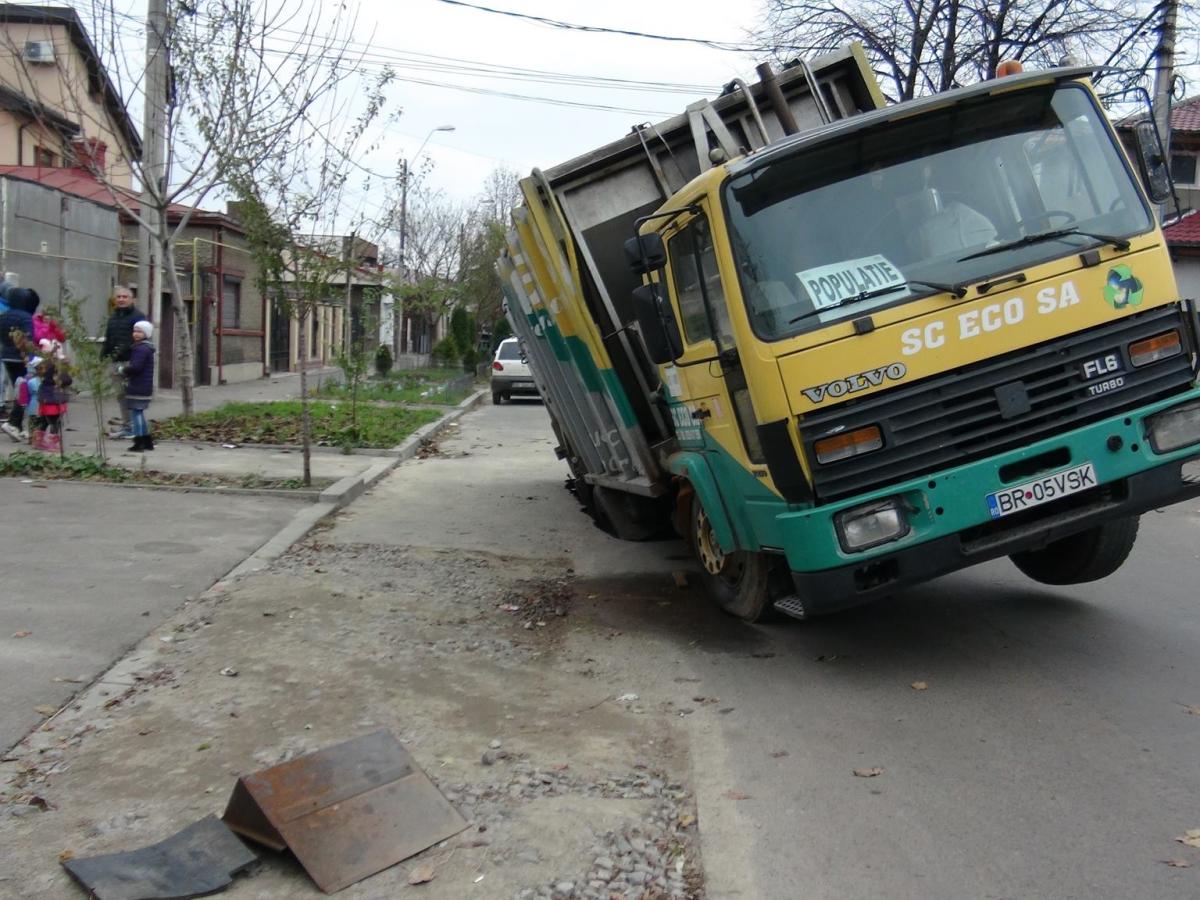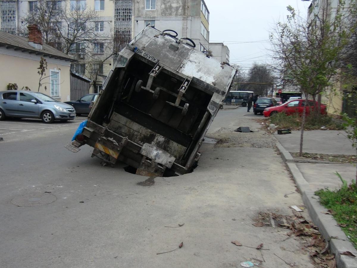 Una câte una străzile Brăilei se surpă sub greutatea maşinilor. După ce acum câteva luni asfaltul s-a rupt sub două maşini, în această dimineaţă o maşină de gunoi a ajuns într-o groapă, pe stradă Graţiei. Maşina s-a înclinat, şoferul a coborât, a scos bateriile, iar după câteva minute autovehiculul s-a afundat mai mult.