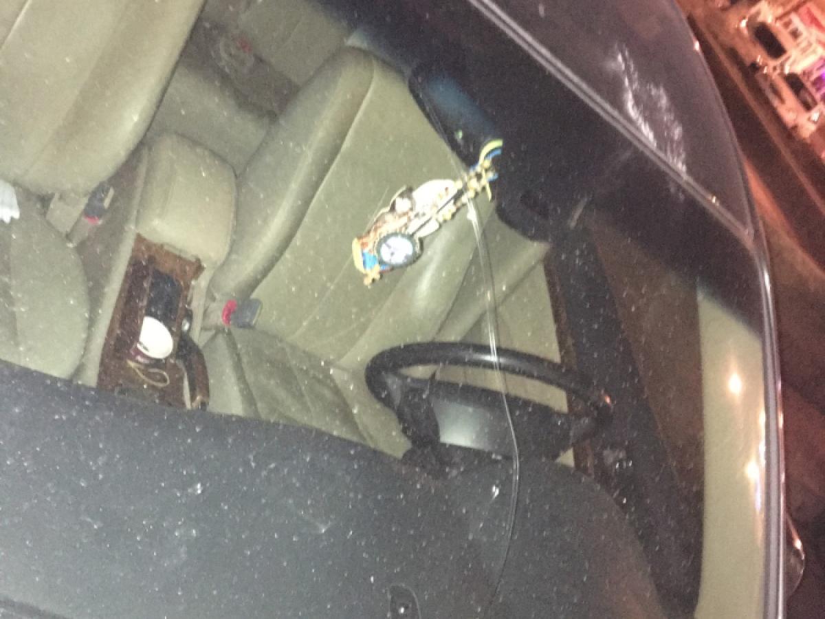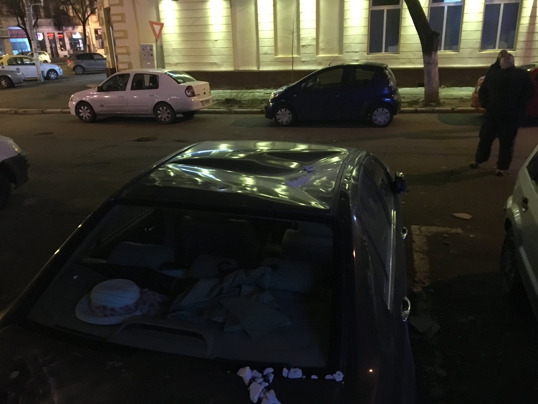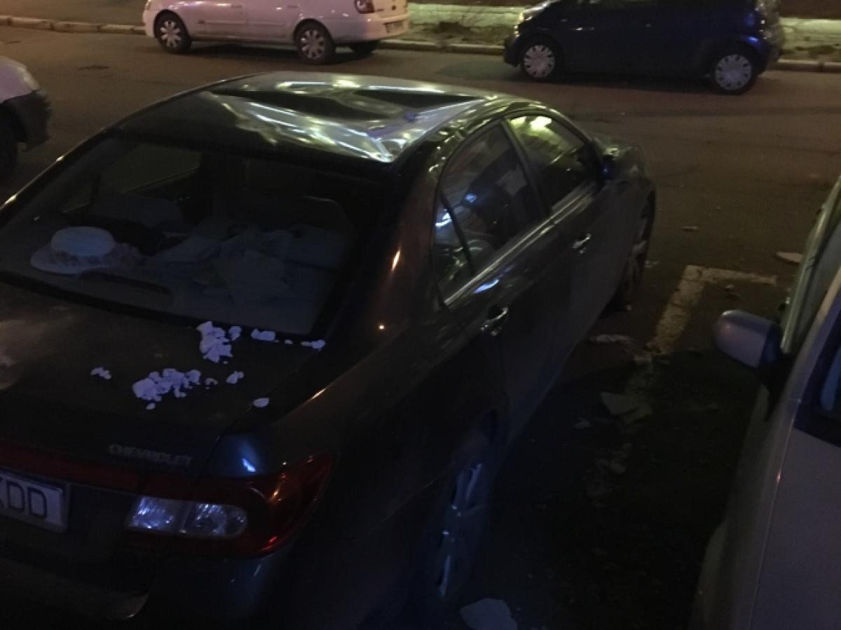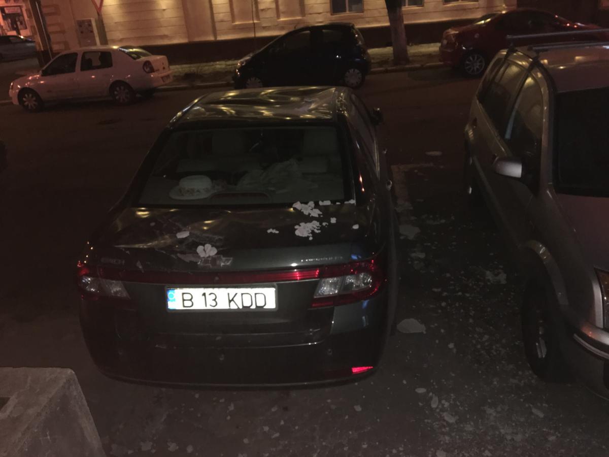 * păgubaşul s-a ales cu plafoniera, capota şi portiera îndoite, plus parbrizul crăpat * acum vrea să facă plângere asociaţiei de propietari