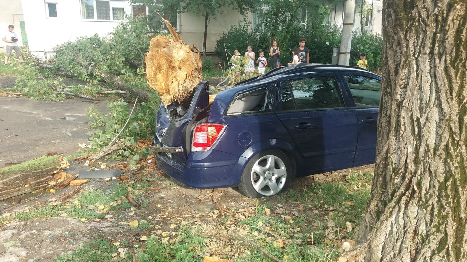 Un autoturism Opel, parcat în spatele blocului A9, a fost făcut praf acum puţin timp de plopul rupt de la jumătate. Copacul a căzut peste blocul de vizavi, apoi peste autoturism.