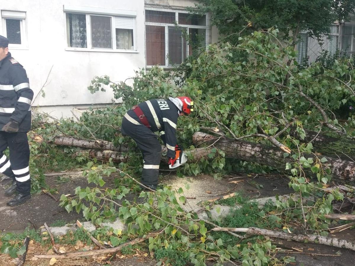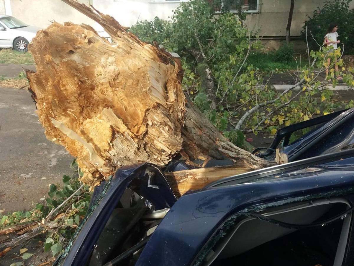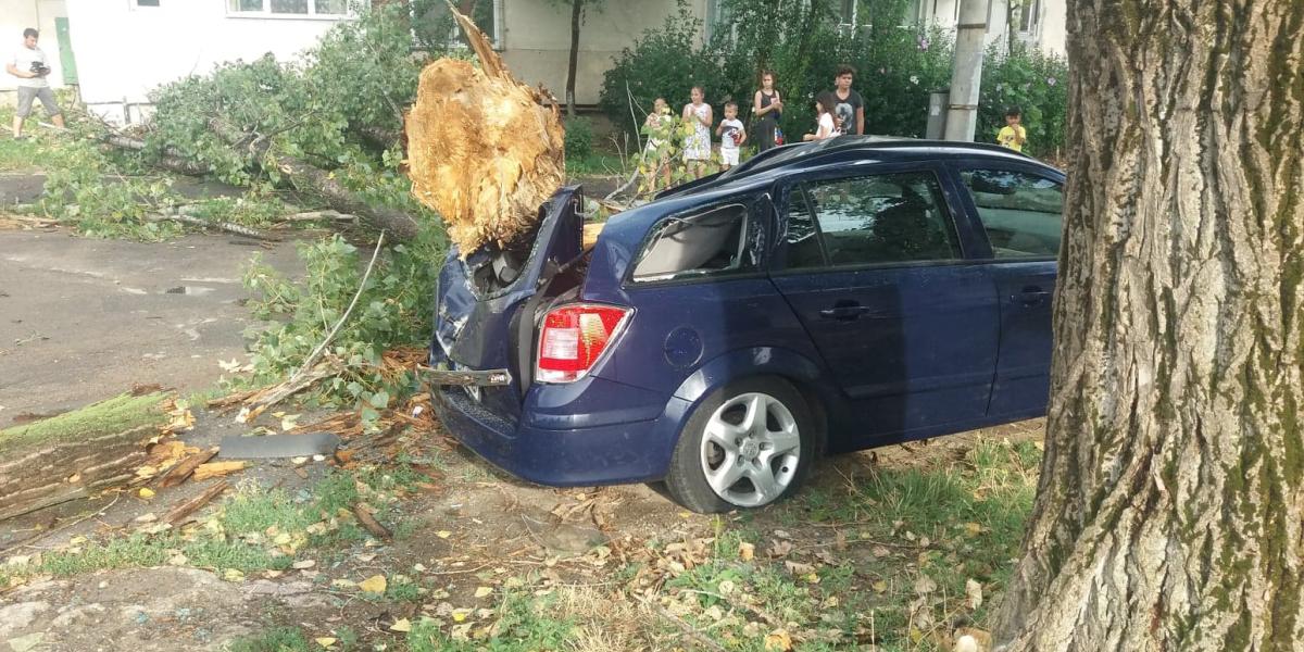 * copacul s-a rupt de la jumătate, deşi furtuna a fost de scurtă durată, şi a căzut inclusiv pe blocul din apropiere * un autoturism Opel parcat în zonă a fost făcut praf * vineri, reprezentanţi ai Primăriei au fost în cartier, unde sunt mai mulţi plopi, însă nu au tăiat copacul care a căzut acum, spunând că este bun