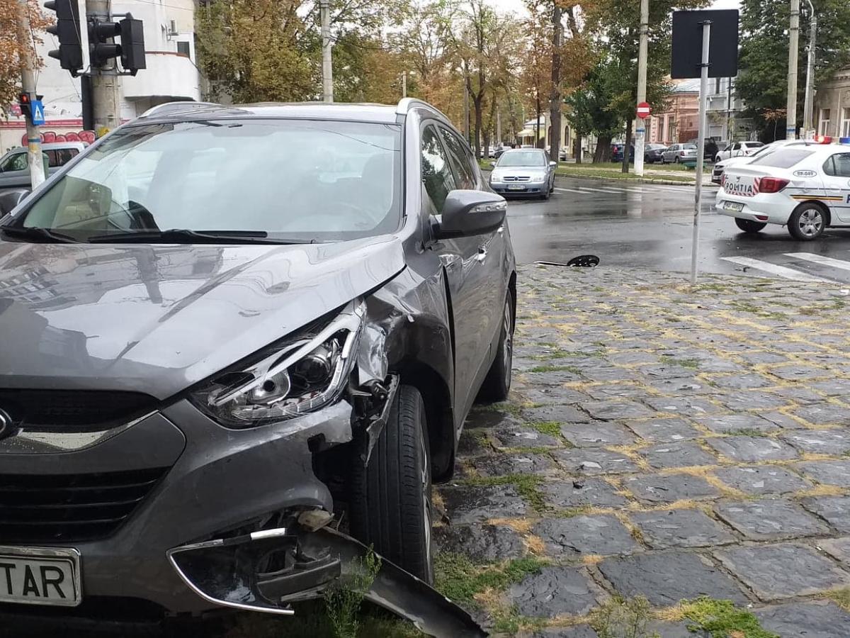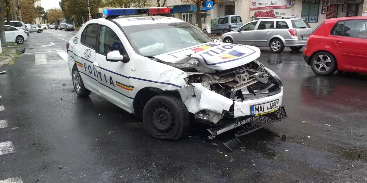 O mașină de poliție aflată în misiune a fost lovită de un autoturism Hyundai care nu i-a acordat prioritate de trecere. Accidentul s-a produs la intersecția str. Școlilor cu Bulevardul Cuza, însă nu au rezultat victime.
