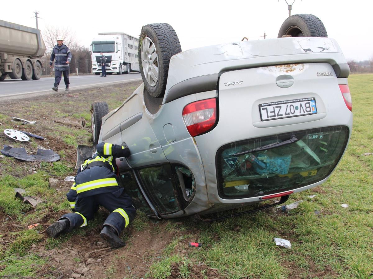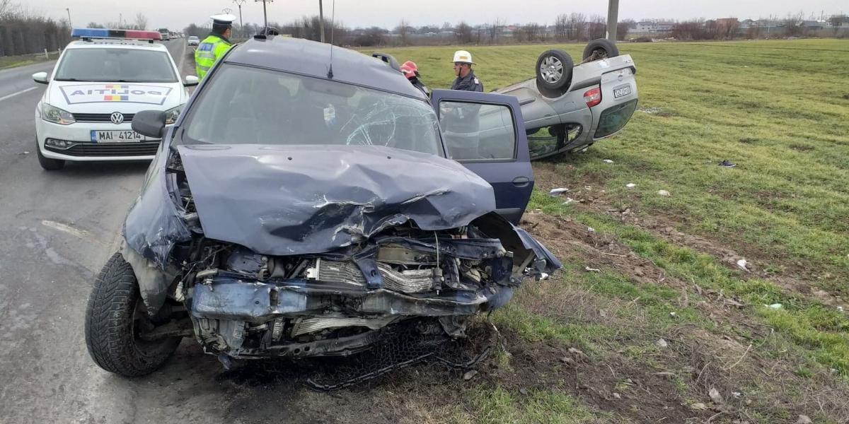 Accident rutier pe șoseaua de Centură, în urma impactului dintre două autoturisme. O mașină s-a răsturnat, două persoane au ajuns la spital, iar traficul a fost blocat pe un sens de mers.