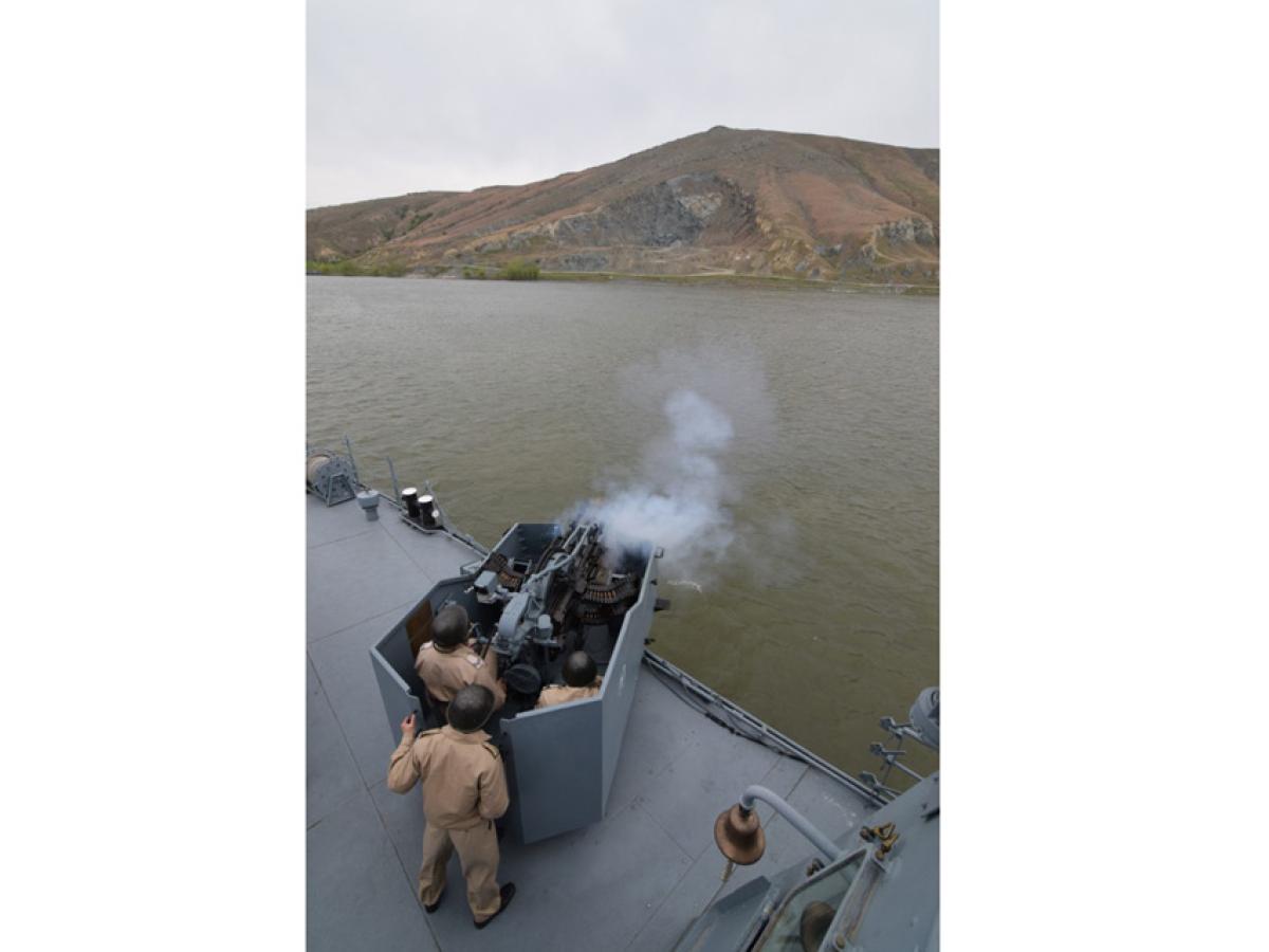 • în prima săptămână a lunii aprilie, s-a desfăşurat în poligonul din judeţul Tulcea o amplă aplicaţie la care au participat zece nave şi 300 de militari ai Flotilei Fluviale • în ciuda vremii neprielnice, militarii brăileni şi-au demonstrat priceperea în mânuirea armamentului din dotare