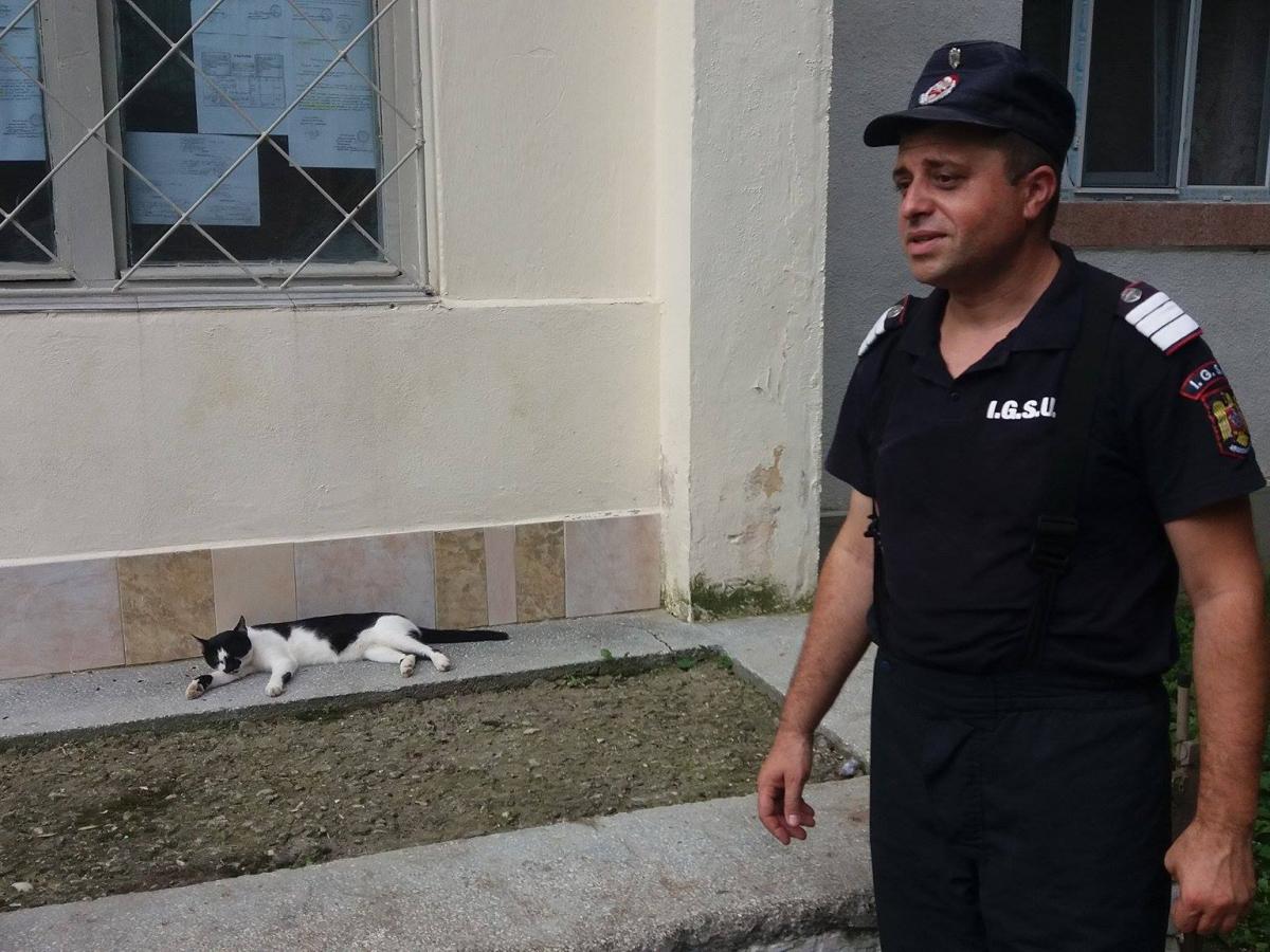 Timp de o oră, salvatorii s-au chinuit să scoată pisicul din spațiul îngust, iar misiunea a fost încheiată cu succes.