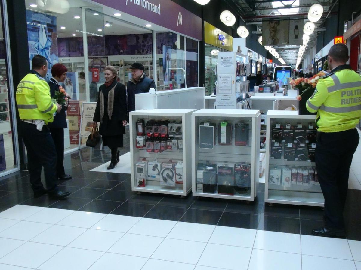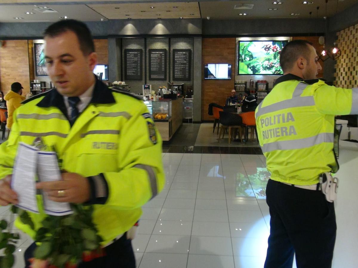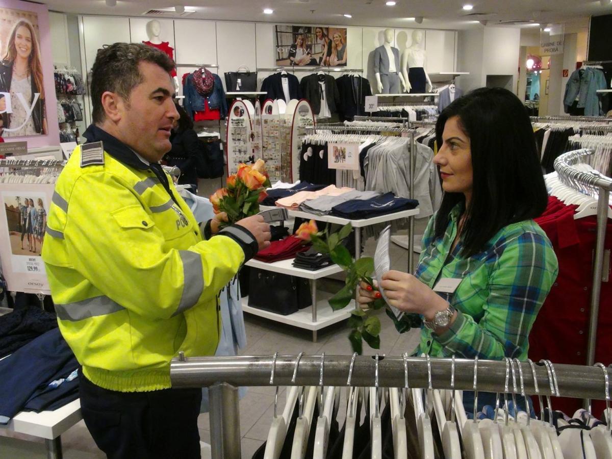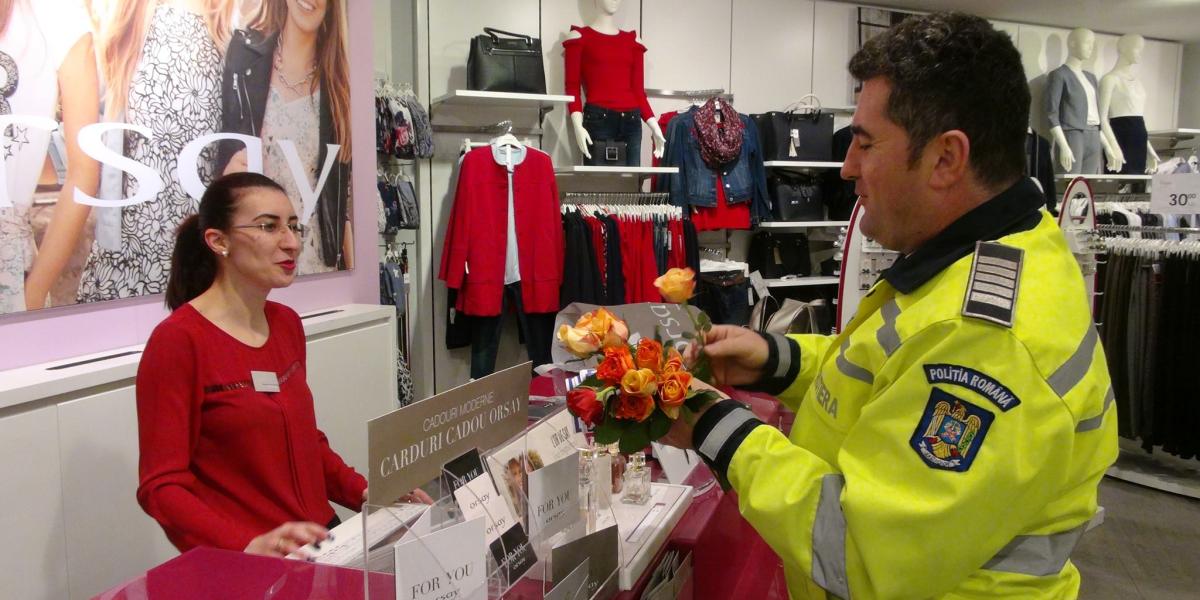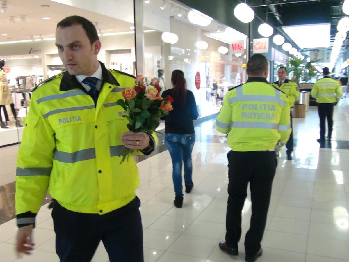 * de Ziua Internațională a Femeii, poliţiştii rutieri, împreună cu cei din cadrul Compartimentului Analiza şi Prevenirea Criminalităţii ai IPJ, au fost în „acțiune” * cu brațele pline de trandafiri, oamenii legii au mers pe Calea Călărașilor - în fața Primăriei, la Mall, la o fabrică de confecții și la Maternitate, unde au împărțit sute de fire de flori
