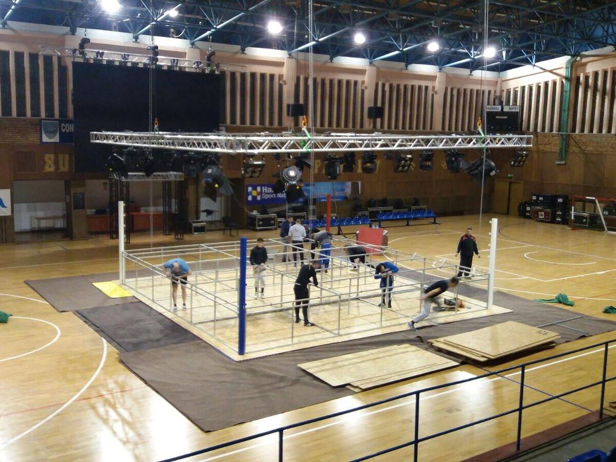 * organizatorii au început deja să monteze ringul de box * Campionatul European de box U22 începe marţi, 14 martie, la Brăila * la primul european de box organizat în ţara noastră participă 249 de pugilişti din 31 de ţări * brăilenii Marian Piţa şi Robert Jitaru sunt gata pentru a lua startul spre podiumul primei ediţii continentale de box U22 * “Boxul se întoarce acasă”, este sloganul europenelor, spune Vasile Priceputu, preşedintele comitetului de organizare