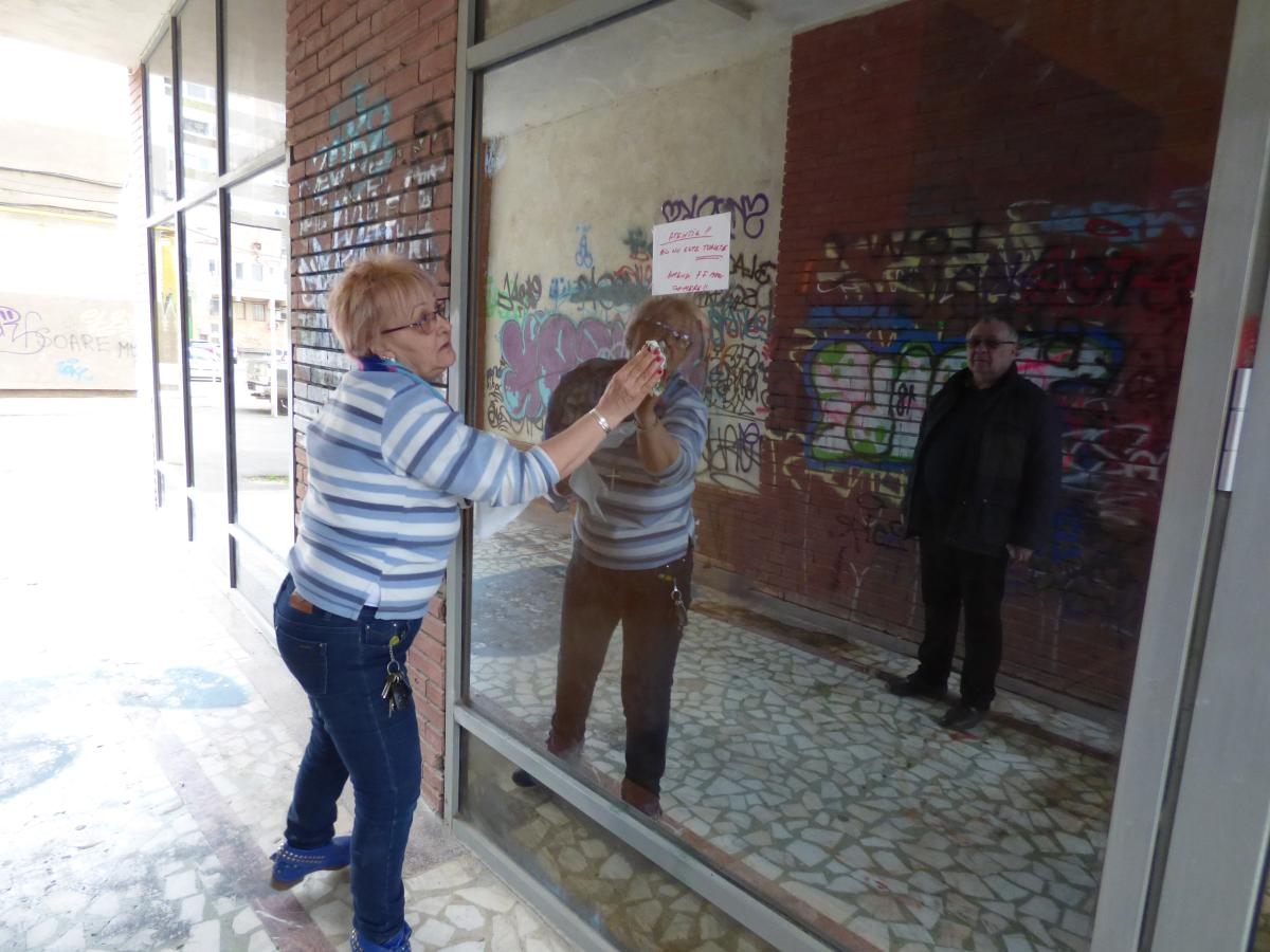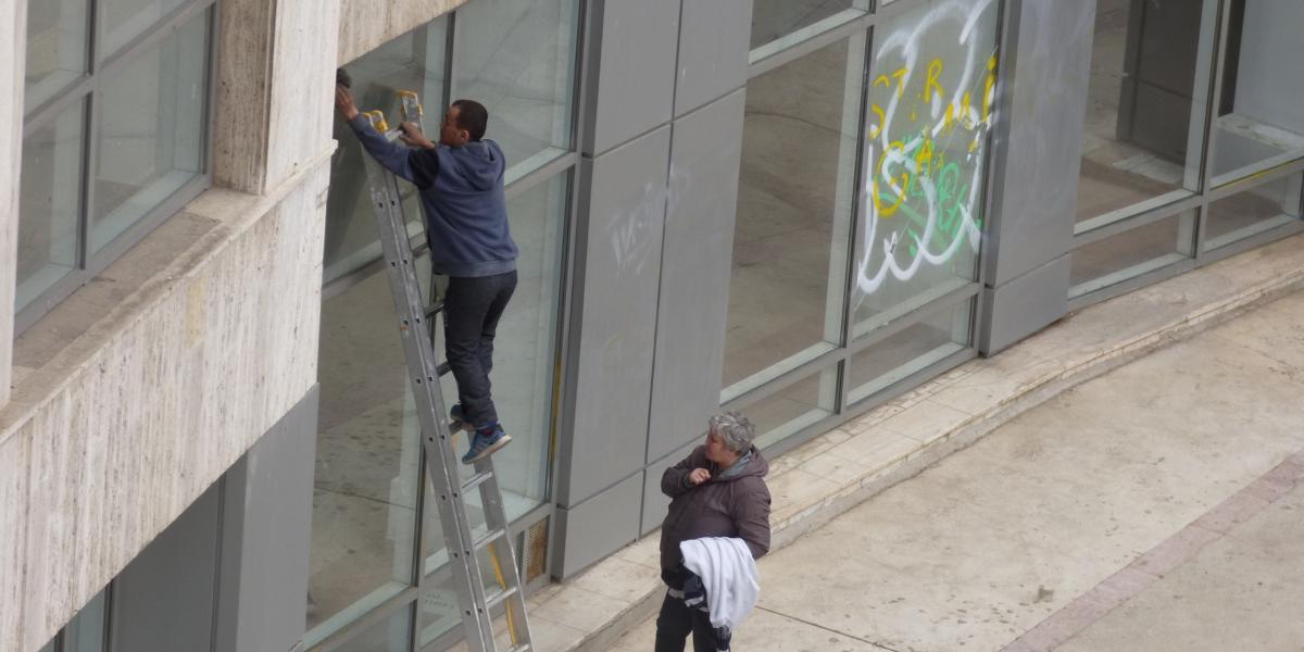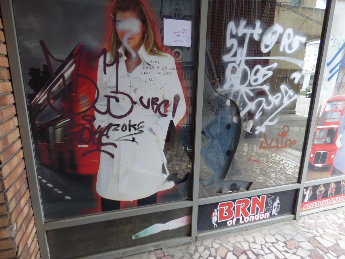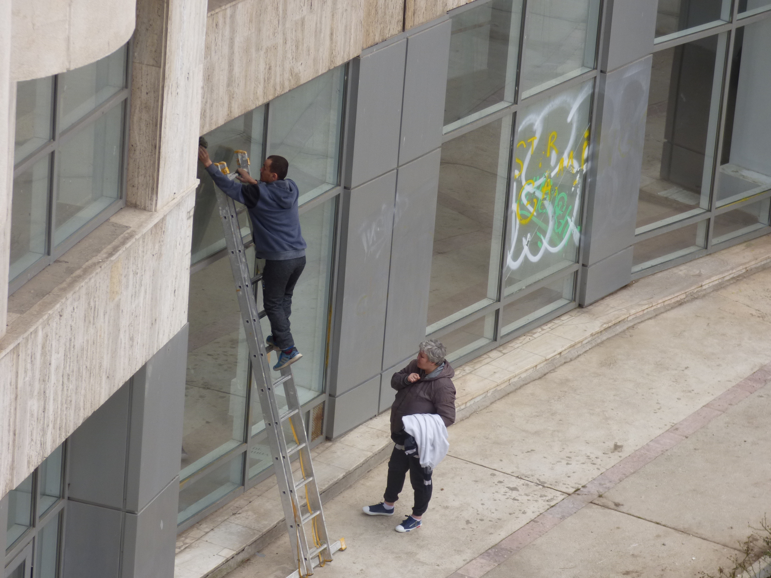 * asociaţia de proprietari din blocul unde se află imensul spaţiu comericial nu a mai suportat situaţia şi s-a apucat să şteargă “operele de artă” de pe vitrine * munca a fost asigurată de asociaţie, însă proprietarul magazinului a fost de acord să suporte costurile operaţiunii * urmează să fie şterse şi zidurile * vestea bună este că şi locul de joacă pentru copii, din apropiere, a fost reabilitat de Primărie * vestea proastă e că nu se iau măsuri pentru sancţionarea indivizilor puşi pe scandal şi stricăciuni care se adună seară de seară acolo
