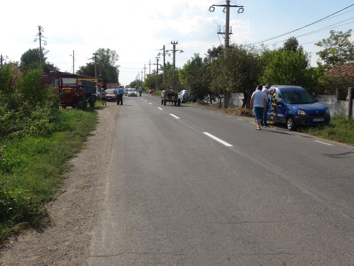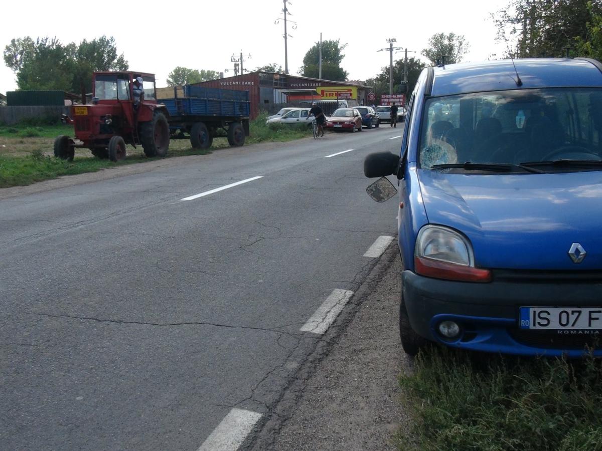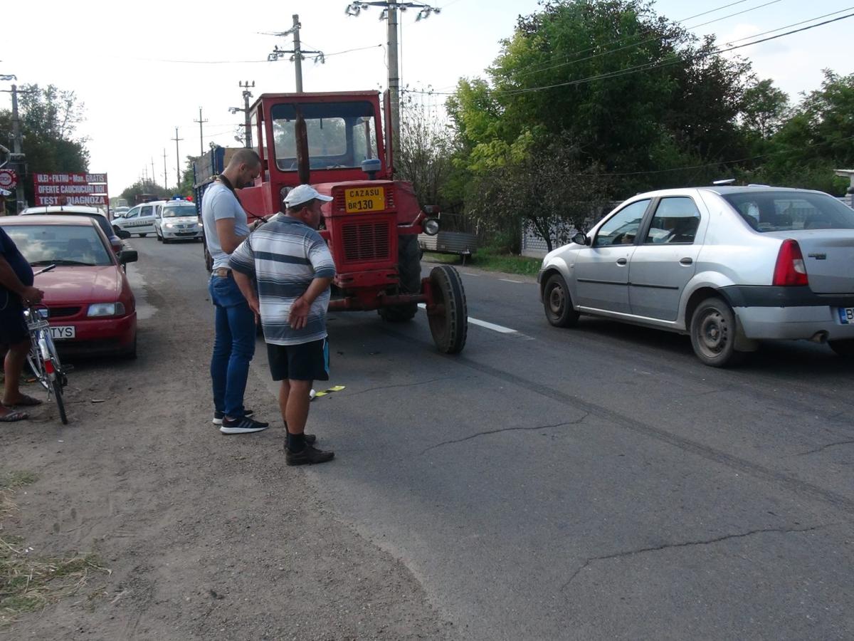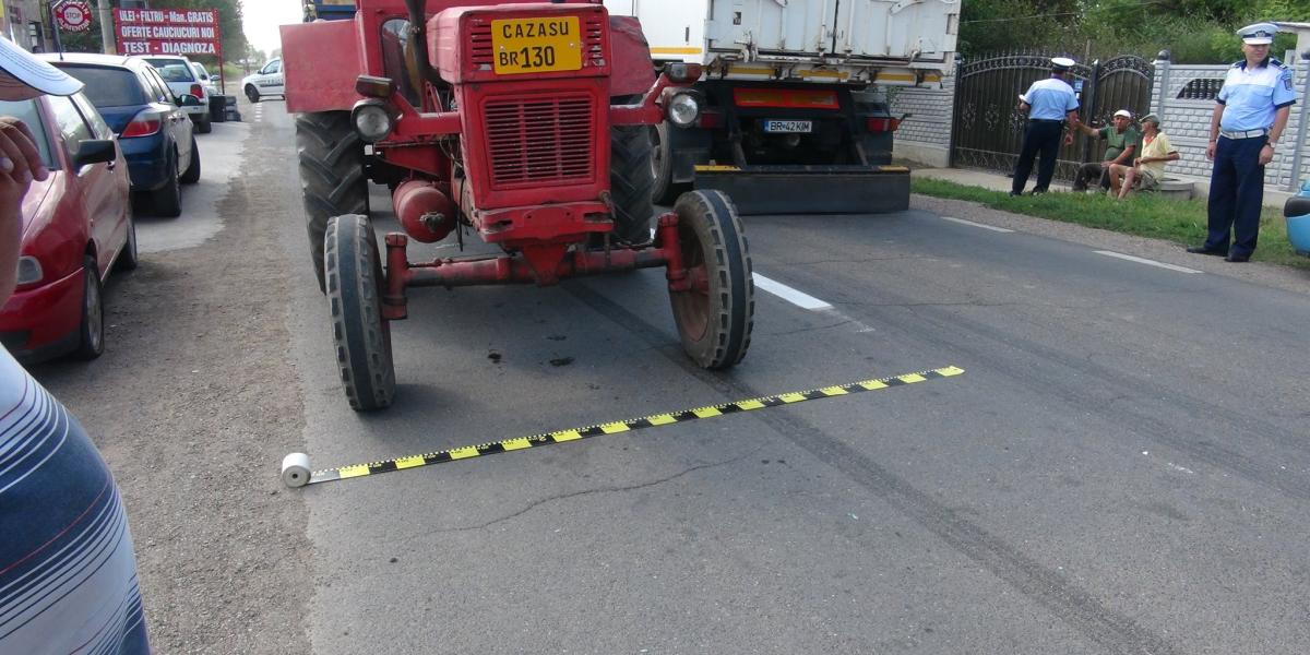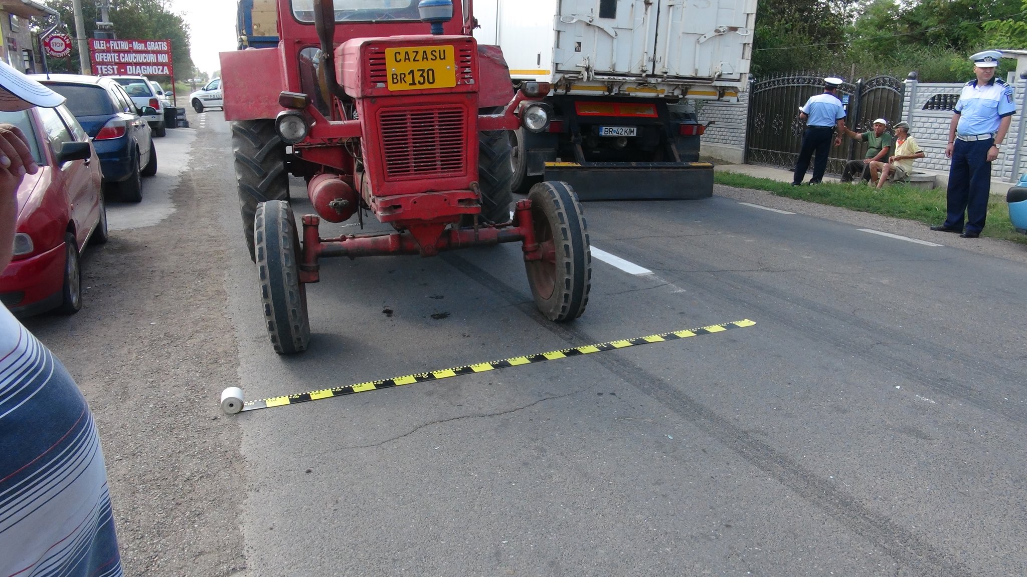 Un tractorist care venea dinspre Tudor Vladimirescu a redus viteza la intrarea în localitate, moment în care fiul sau de 24 de ani a sărit din tractor pentru a merge la un chioşc să-şi cumpere ţigări. Săritură putea să-i fie fatală, din spate venea un autoturism care s-a angajat în depăşirea tractorului şi l-a surprins şi lovit pe tânărul neatent. Victima a juns la spital cu multiple fracturi, iar poliţiştii au deschis dosar penal pentru vătămare corporală din culpă.