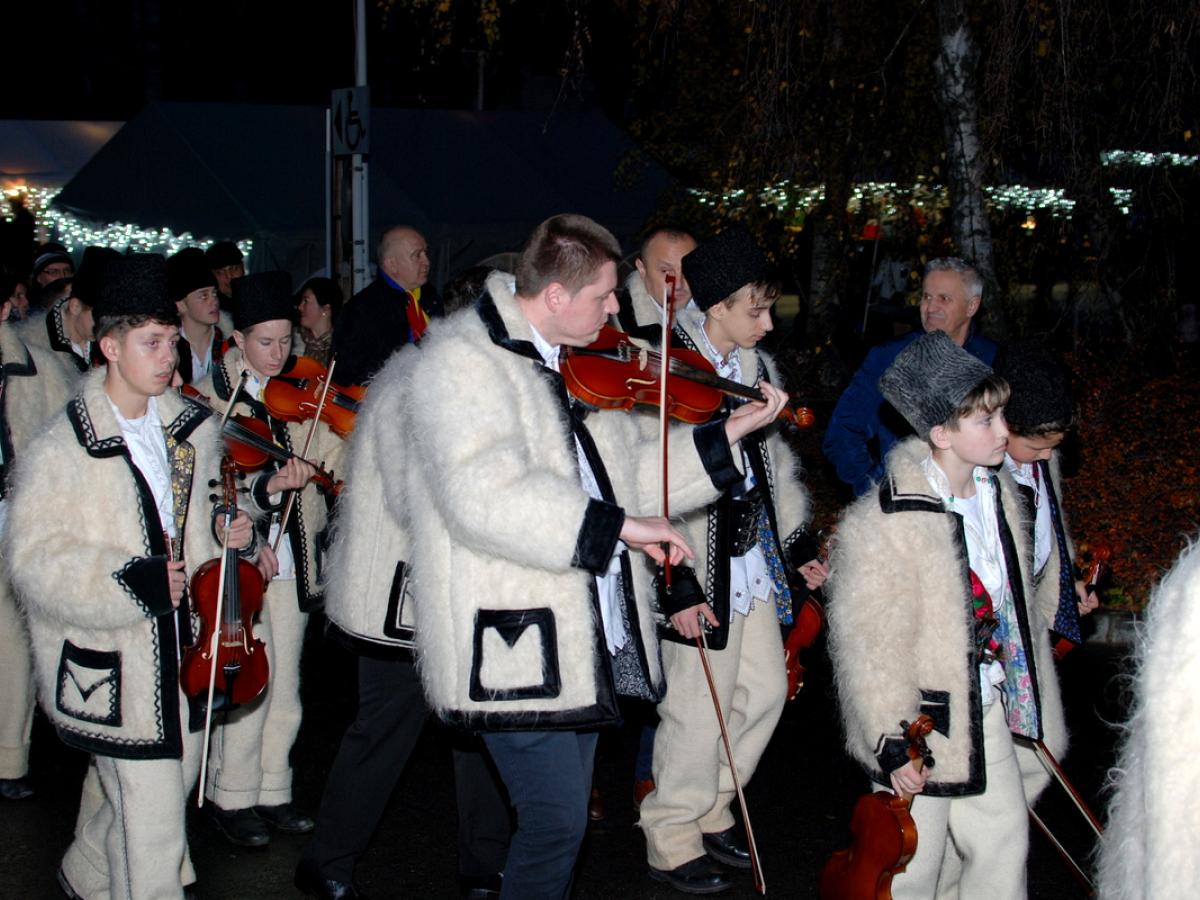 * instalațiile luminoase au fost aprinse la ora 16.50, după ce alaiul colindătorilor porniți din cartierul Viziru a ajuns în Piața Independenței