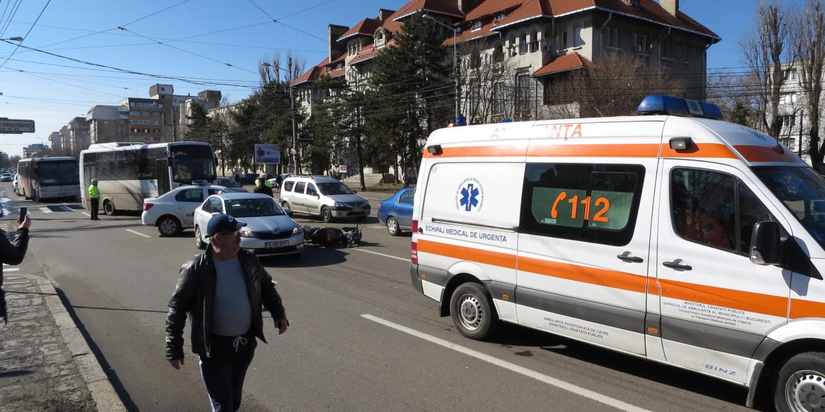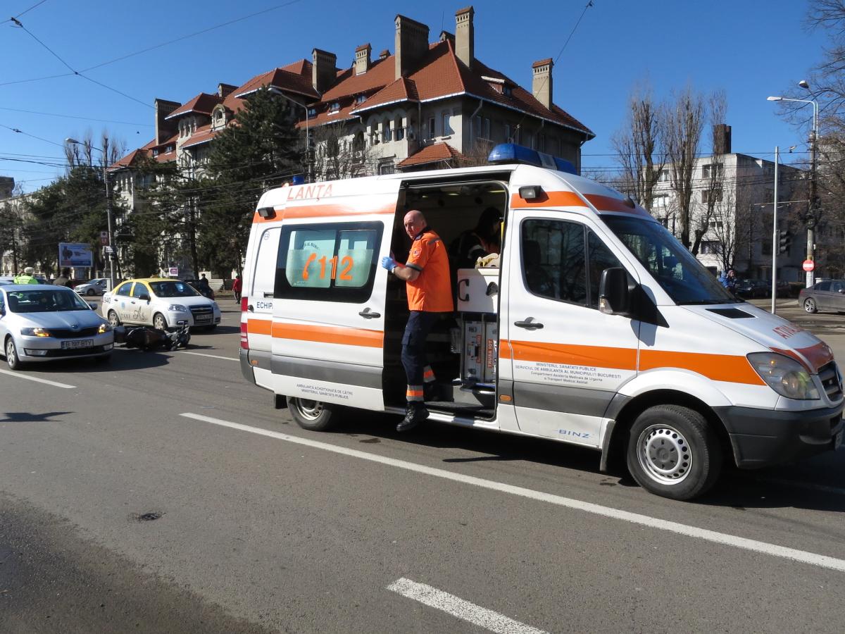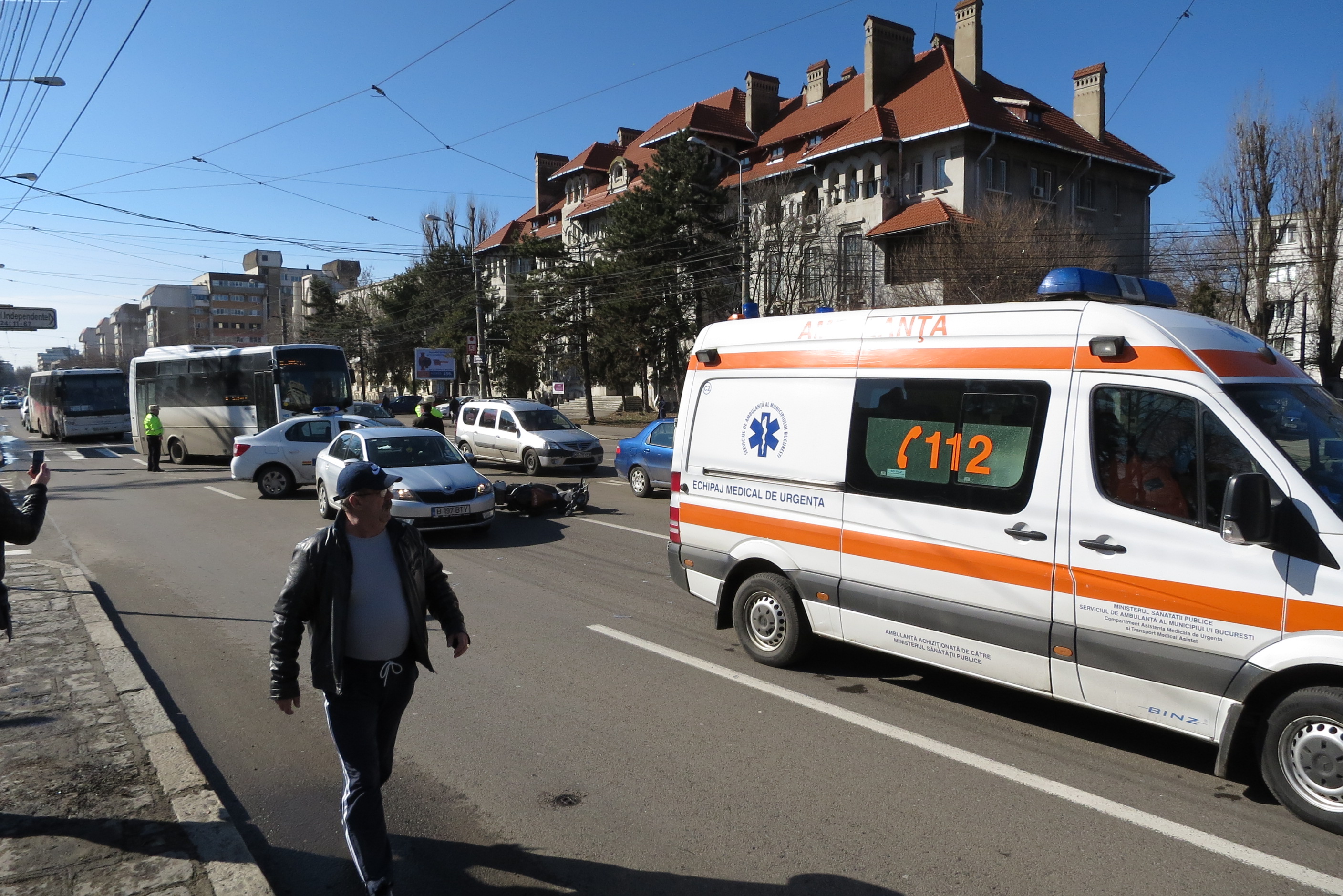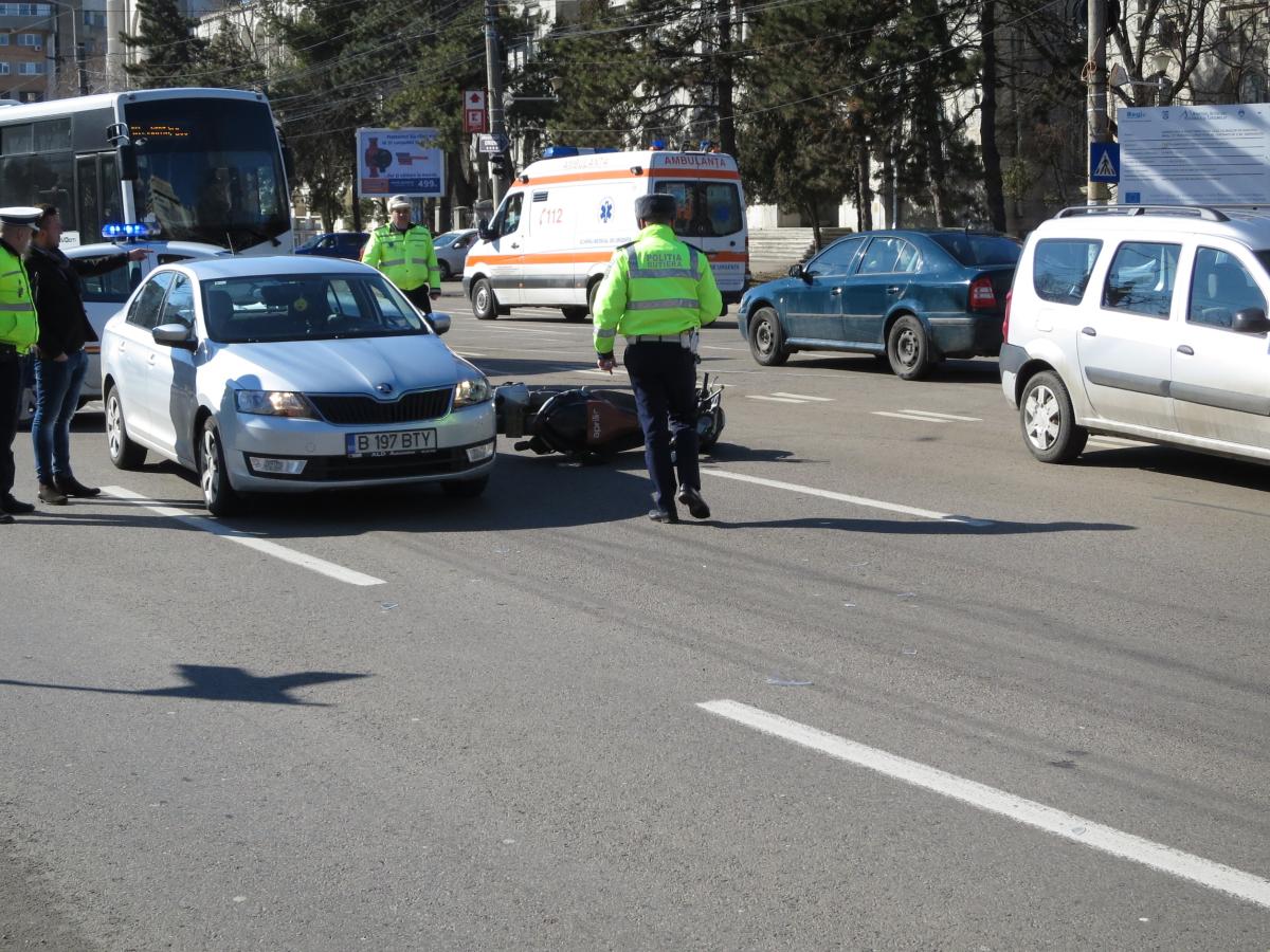 * acesta circula pe Bulevardul Independenței și la intersecția cu Calea Călăraților nu a acordat prioritate unui autoturism Skoda * bărbatul de 53 de ani aflat pe scuter a fost trântit la pământ, el fiind preluat de ambulanță